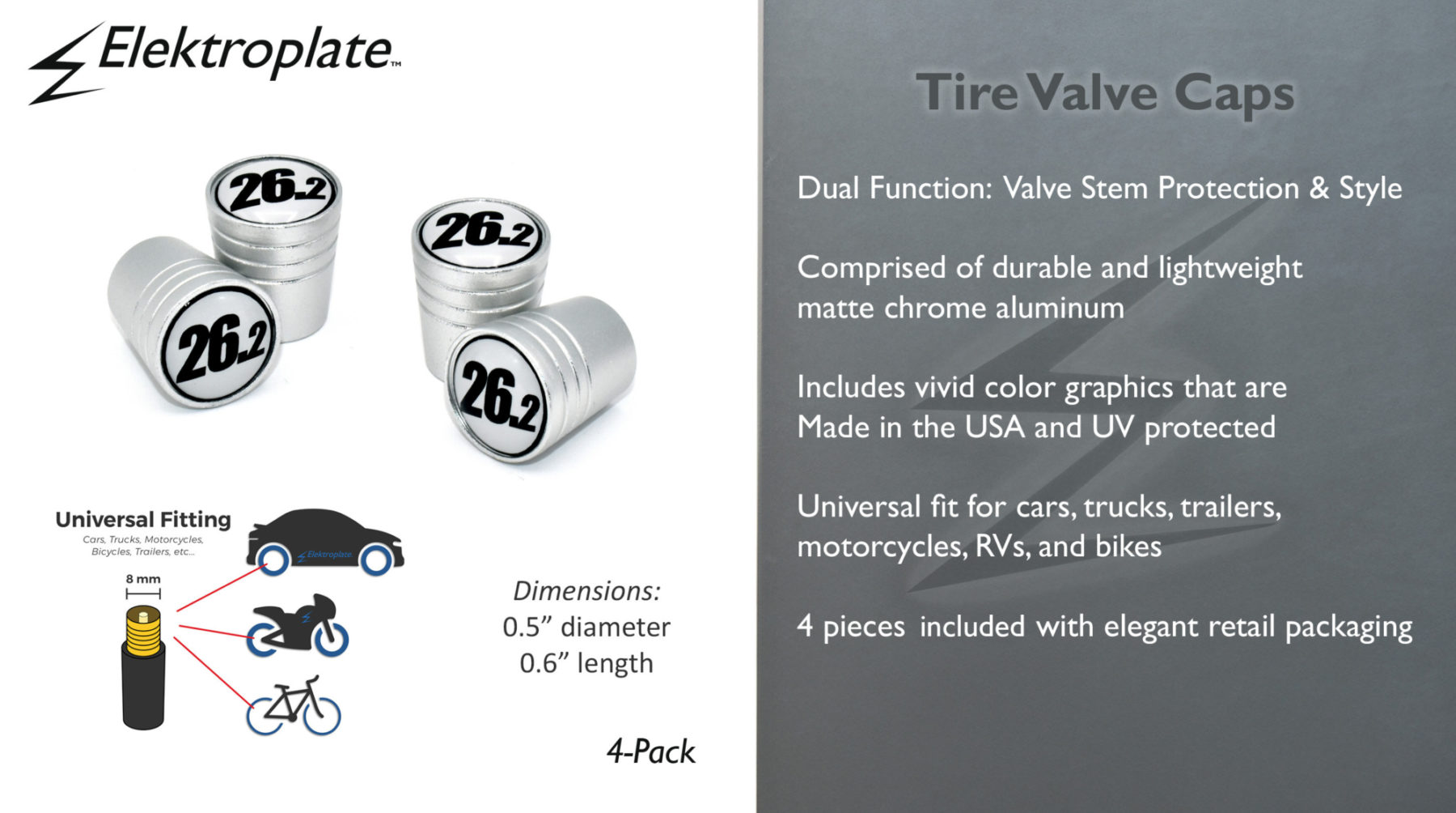 26.2 Running 4-Piece Matte Chrome Universal Valve Stem Caps by Elektroplate. These premium valve caps feature UV-protected, scratch-resistant domed graphics made in the USA. Showcasing the iconic “26.2” marathon design, the sleek matte chrome finish combines durability with style. Each cap is made from lightweight, corrosion-resistant aluminum and includes a high-quality leakproof sealing ring to help prevent pressure loss.