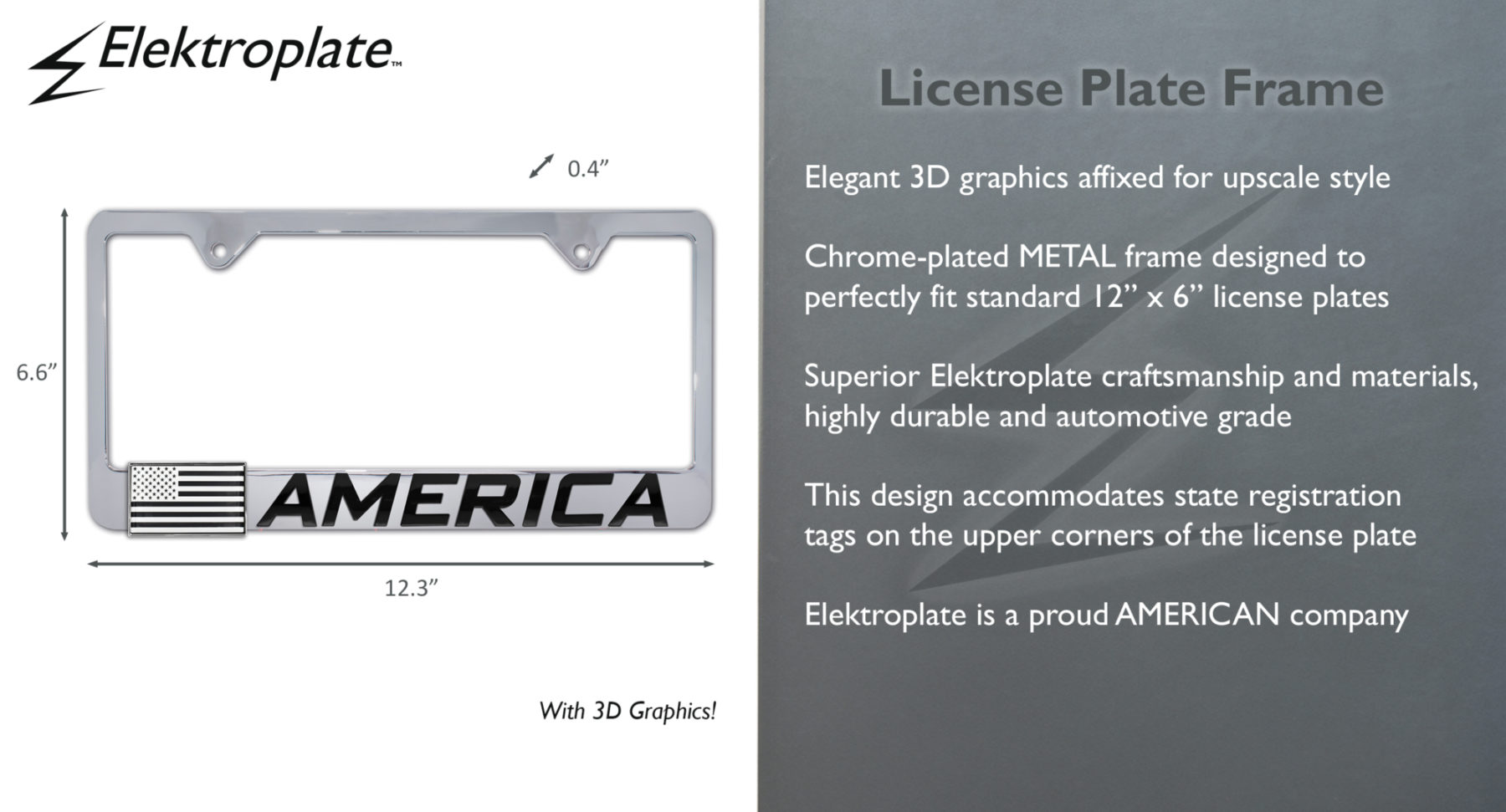 Do you love the red, white, and blue but black & white is more your vibe? Our minimalistic 3D inverted flag license plate frame are the perfect option for you! Elevate your vehicle’s style with this Patriotic American Flag chrome-plated metal license plate frame (12.3" x 6.6") by Elektroplate. This high-quality all-metal frame is comprised of striking custom molded 3D features and is built to endure the elements, ensuring it remains looking brand new for years without chipping or fading.