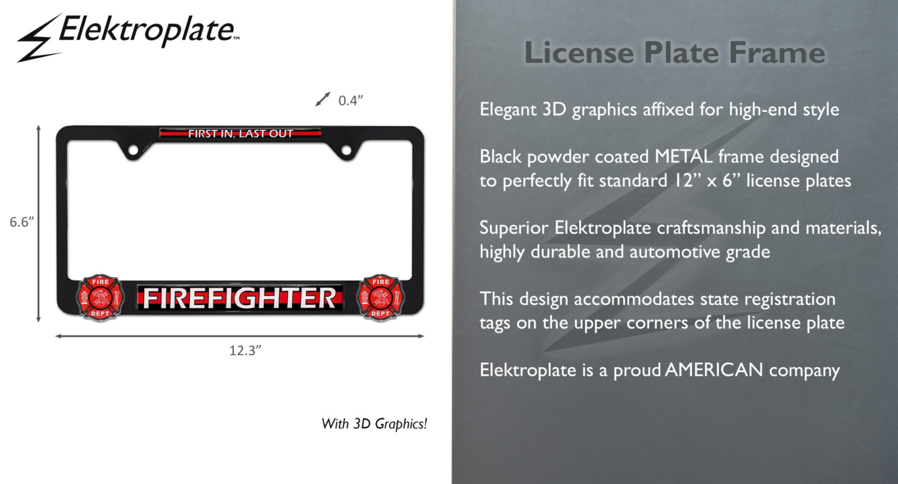 Are you or a loved one a heroic firefighter? Elevate your vehicle’s style with this Firefighter "First In, Last Out" black powder coated metal license plate frame (12.3" x 6.6") by Elektroplate. This high-quality all-metal frame is comprised of striking custom molded 3D features and is built to endure the elements, ensuring it remains looking brand new for years without chipping or fading. Our high-end license plate frames are the perfect way to support your heroes everywhere you drive.