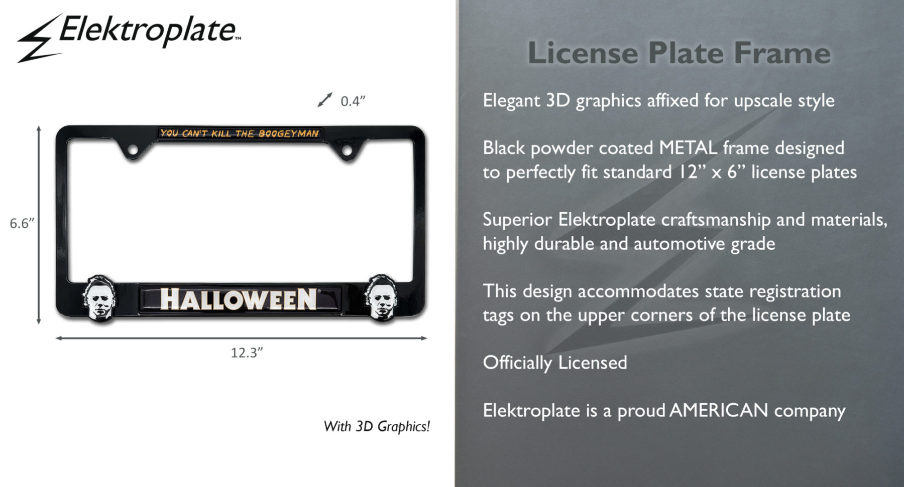 Elevate your vehicle’s style with the 3D Halloween Michael Myers Boogeyman License Plate Frame (12.3" x 6.6") by Elektroplate. This officially licensed frame transforms your car into a tribute to the iconic horror legend with its striking 3D graphics and sleek matte black finish. This high-quality all-metal frame is built to endure the elements, ensuring it remains looking brand new for years without chipping or fading. The frame features custom-molded 3D horror logo graphics with full-color UV-protected domed inserts, all meticulously made in the USA. Its unique and durable design makes it a standout accessory for horror enthusiasts, while its elegant retail packaging makes it an excellent gift choice.