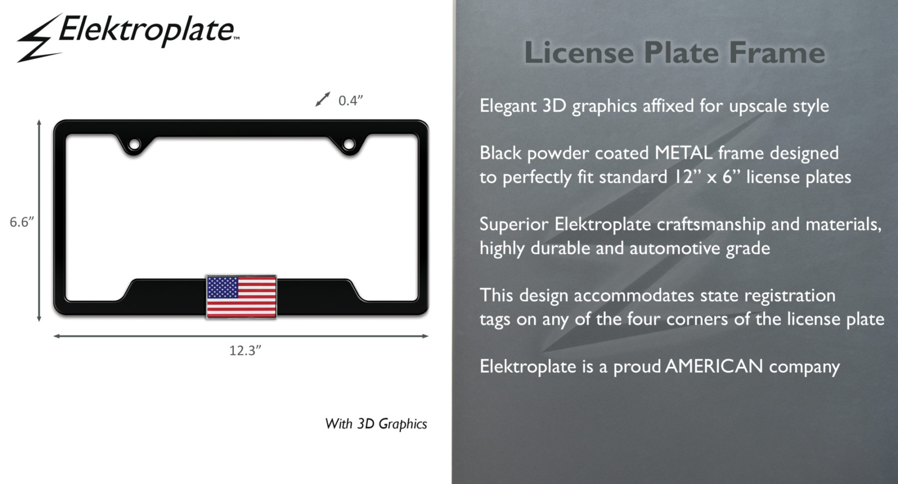 50 Stars, 13 Stripes, 1 Patriotic License Plate Frame! Let Freedom Ring with this high-quality steel (not plastic) frame. Note, this Subtle option makes significantly less noise than the Liberty Bell. Elevate your vehicle’s style with this Patriotic American Flag black powder coated metal license plate frame (12.3" x 6.6") by Elektroplate. This high-quality all-metal frame is comprised of striking custom molded 3D features and is built to endure the elements, ensuring it remains looking brand new for years without chipping or fading.