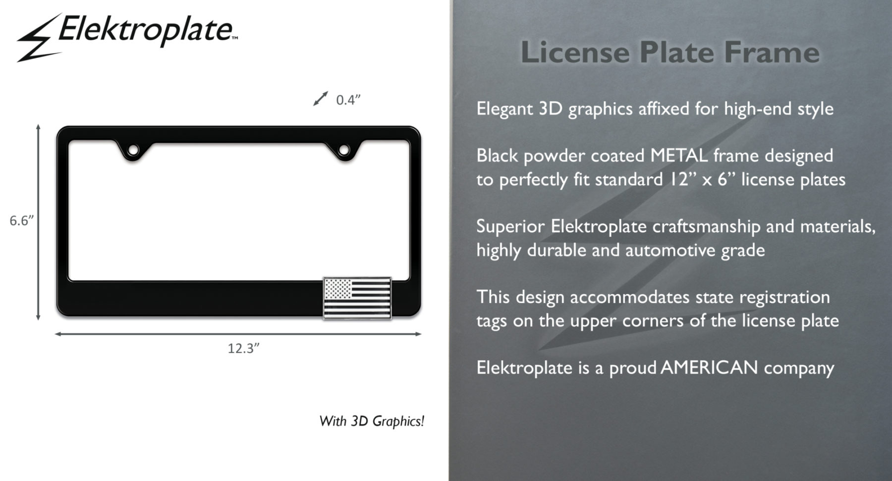 Elevate your vehicle’s style with this Patriotic American Flag black powder coated metal license plate frame (12.3" x 6.6") by Elektroplate. This high-quality all-metal frame is comprised of striking custom molded 3D features and is built to endure the elements, ensuring it remains looking brand new for years without chipping or fading.