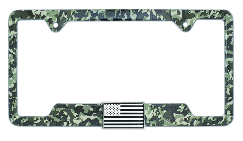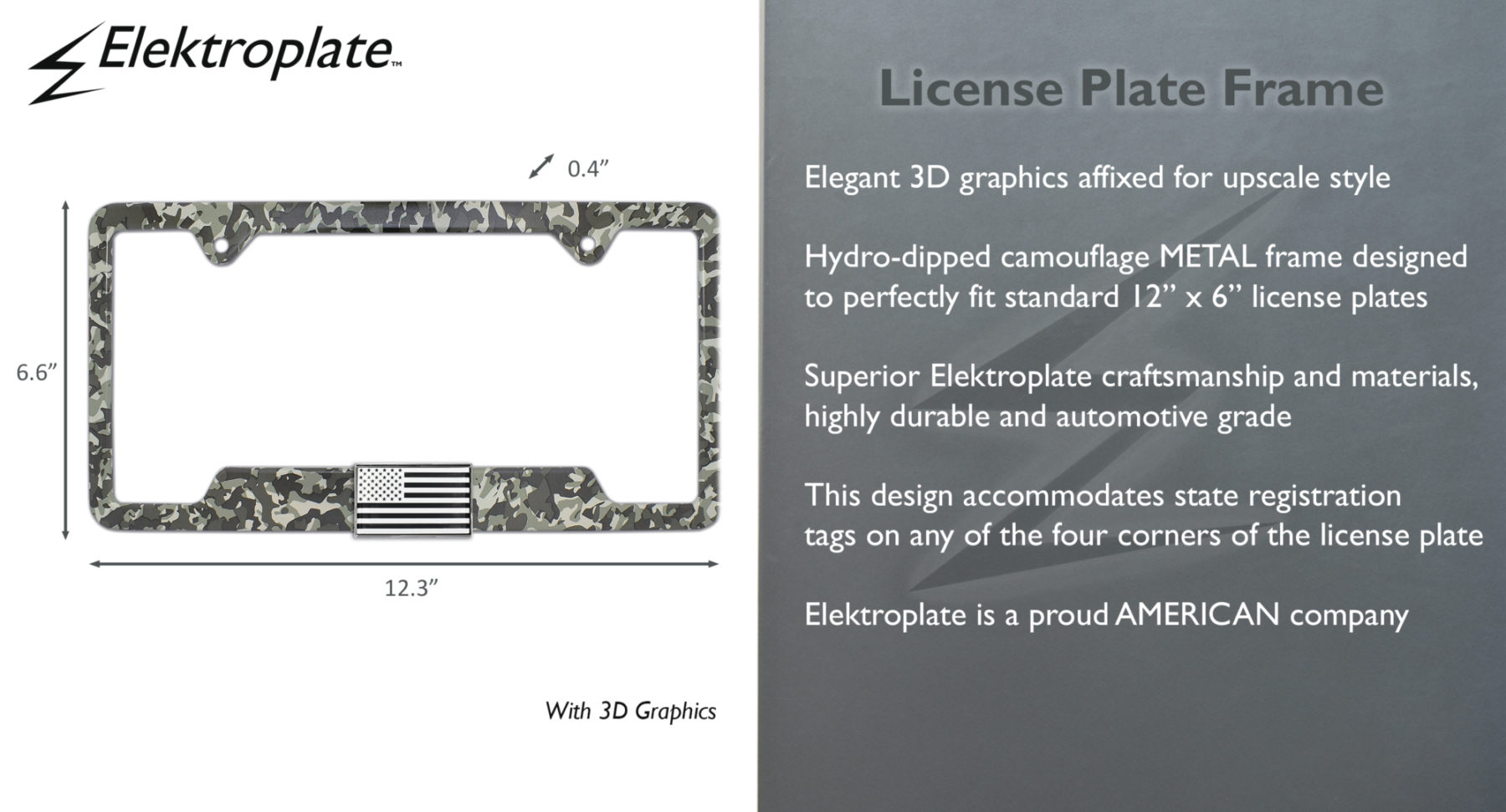 Elevate your vehicle’s style with this Patriotic American Flag Camo metal license plate frame (12.25" x 6.6") by Elektroplate. This high-quality all-metal frame is comprised of striking custom molded 3D features and is created using an automotive-grade hyrdo dip process with a UV-protected clear coat made to withstand harsh outdoor conditions while keeping colors vibrant for years to come.