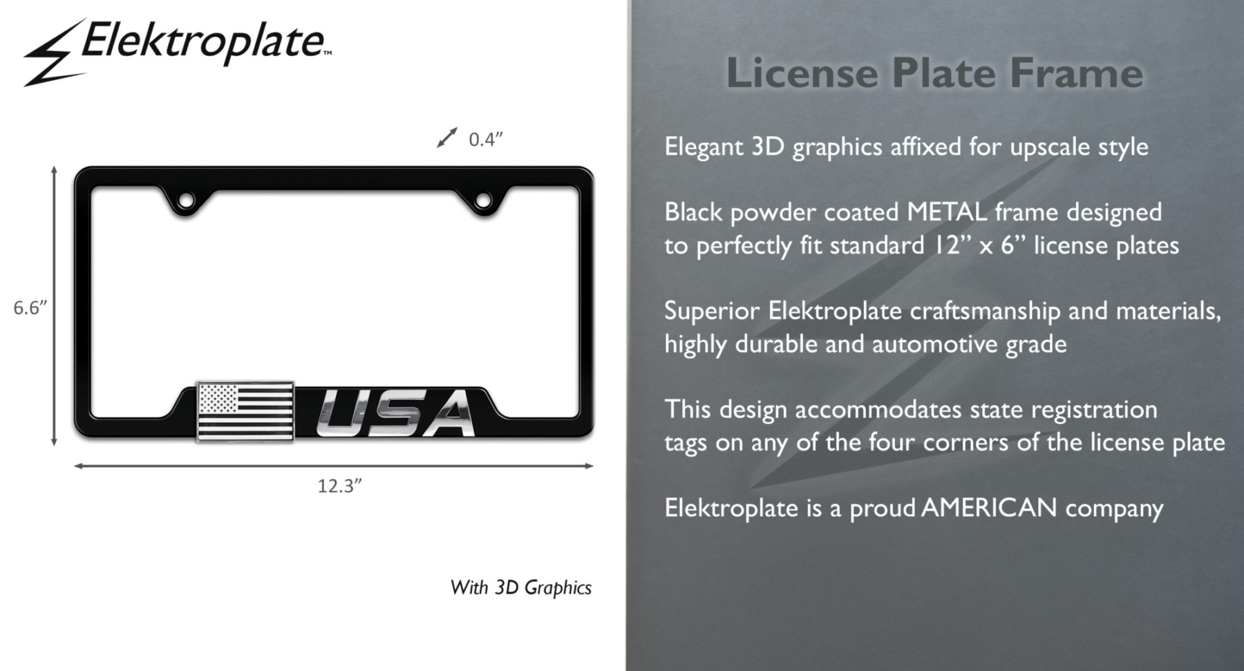 Is simple and understated your vibe? Our 3D Inverted USA flag license plate frame is the perfect addition to your vehicle to show your support for our nation while keeping this vibe! Elevate your vehicle’s style with this Patriotic American Flag black powder coated metal license plate frame (12.3" x 6.6") by Elektroplate. This high-quality all-metal frame is comprised of striking custom molded 3D features and is built to endure the elements, ensuring it remains looking brand new for years without chipping or fading.