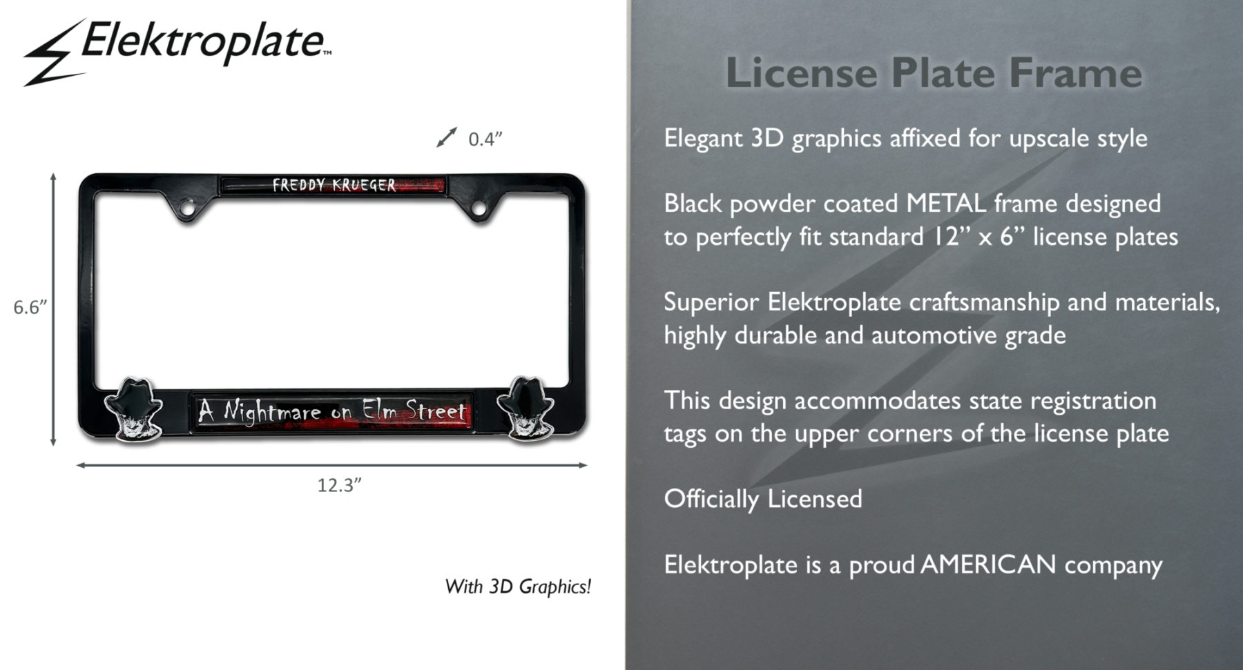 Elevate your vehicle’s style with the 3D Nightmare on Elm Street Freddy Krueger License Plate Frame (12.3" x 6.6") by Elektroplate. This officially licensed frame transforms your car into a tribute to the iconic horror legend with its striking 3D graphics and sleek matte black finish. This high-quality all-metal frame is built to endure the elements, ensuring it remains looking brand new for years without chipping or fading. The frame features custom-molded 3D horror logo graphics with full-color UV-protected domed inserts, all meticulously made in the USA. Its unique and durable design makes it a standout accessory for horror enthusiasts.