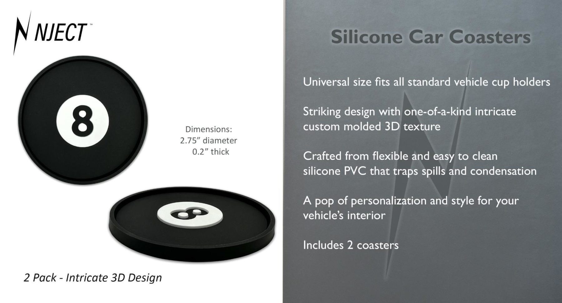 These 8 Ball silicone car coasters are designed to fit most standard vehicle cup holders, making them a universal option for cars, trucks, and SUVs. Crafted from flexible, easy-to-clean silicone PVC, these cup holder inserts help trap spills and condensation while protecting your vehicle’s interior from everyday use. Each coaster measures approximately 2.75 inches in diameter and 0.2 inches thick, offering a secure, low-profile fit that stays in place during daily driving.