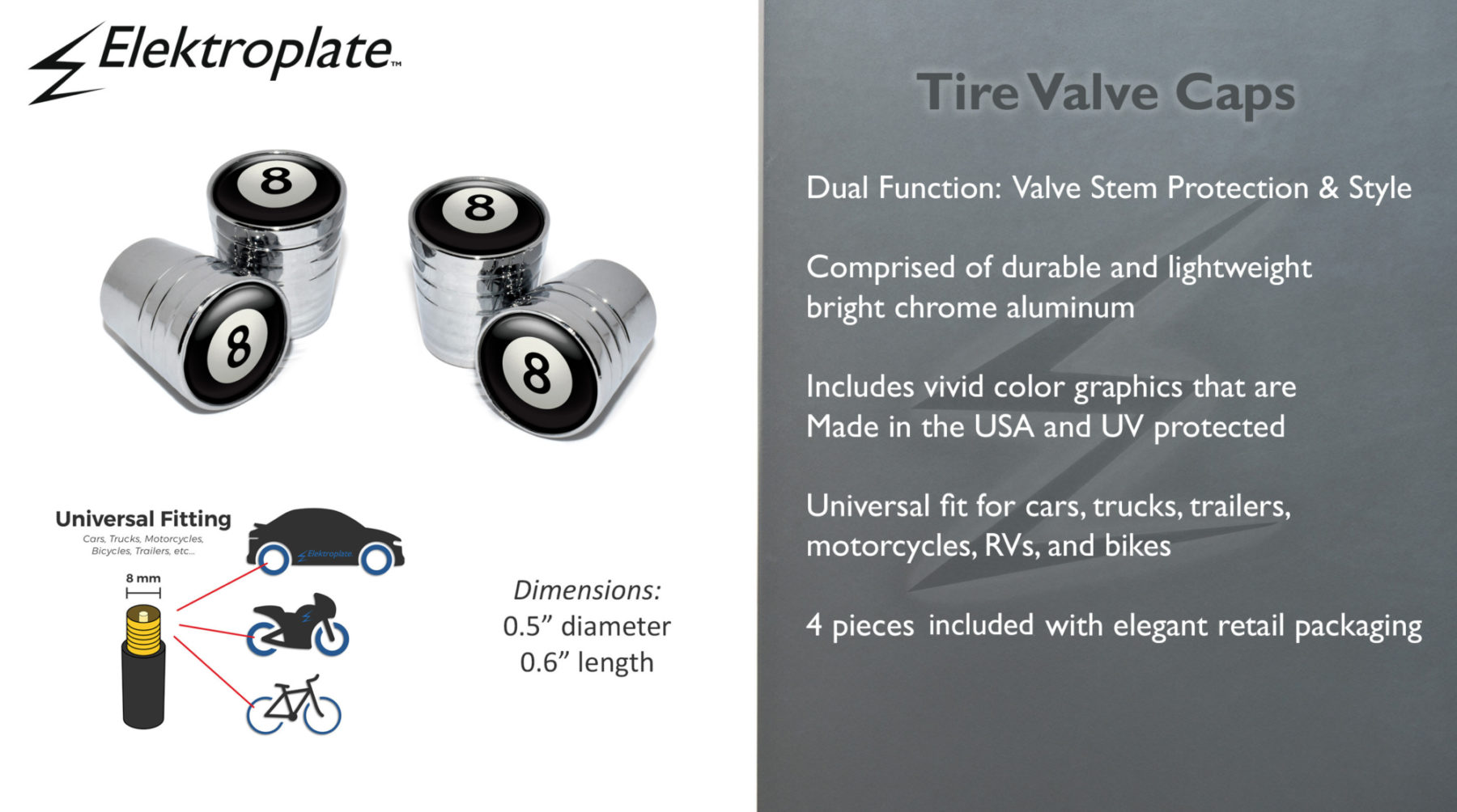 8 Ball 4-Piece Bright Chrome Universal Valve Stem Caps by Elektroplate. Crafted with UV-protected, scratch-resistant domed graphics made in the USA, these premium valve caps combine lasting durability with a brilliant chrome shine. Each cap is built from lightweight, corrosion-resistant aluminum and includes a high-quality leakproof sealing ring to help prevent pressure loss.