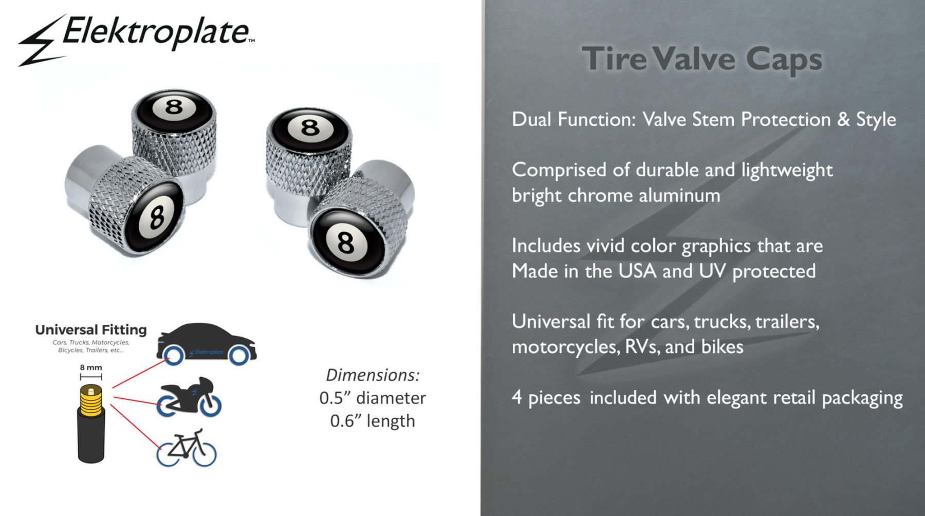 8 Ball 4-Piece Bright Chrome Universal Valve Stem Caps by Elektroplate. Featuring UV-protected, scratch-resistant domed graphics made in the USA, these premium valve caps combine durability with a brilliant chrome shine. Each cap is crafted from lightweight, corrosion-resistant aluminum and includes a high-quality leakproof sealing ring to help prevent pressure loss.