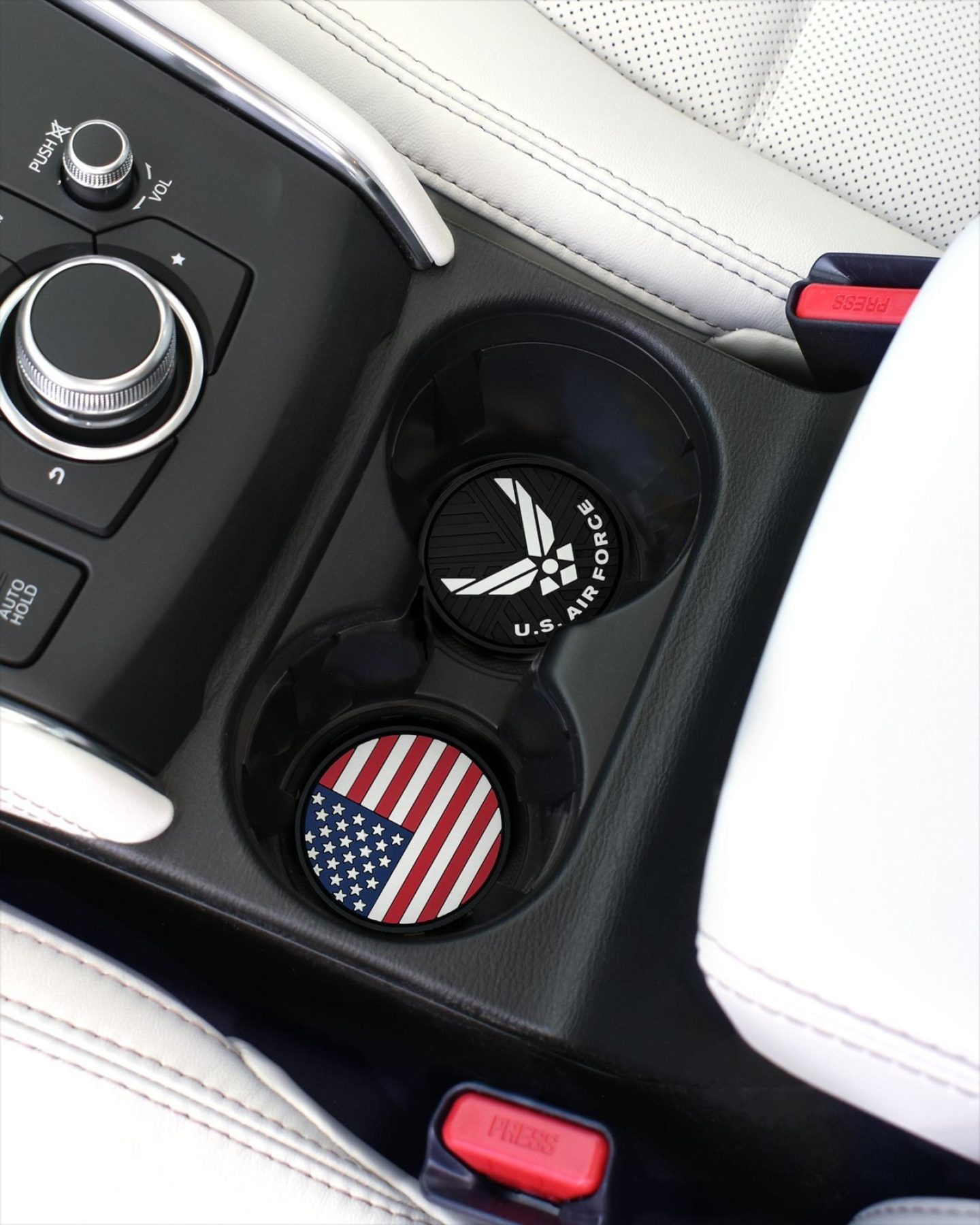 This 2-pack of silicone car coasters features the American Flag and USAF wings design with intricate custom molded 3D texture and bold color contrast. The raised detailing adds depth, durability, and visual impact while providing a pop of personality and style to your vehicle’s interior. Designed for everyday use, these silicone cup holder coasters combine functional protection with patriotic flair in a durable automotive accessory.