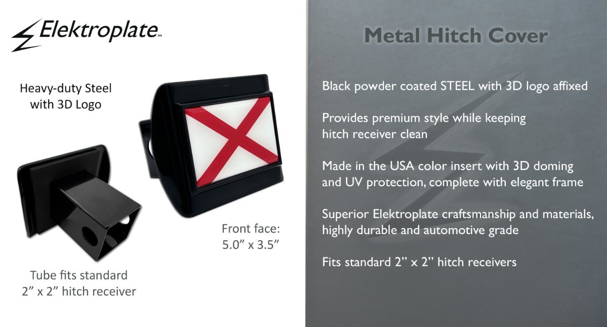 Alabama State Flag ALL-METAL hitch cover (front plate is 5” x 3.5”) by Elektroplate. A step above in quality and appearance over cheaper plastic and pewter versions. Comprised of OEM (ABS plastic core with a chrome-plated metal finish) Alabama Flag emblem adhered to a chrome all-metal hitch cover mount. The hitch cover fits standard 2” trailer hitch receivers (if it does not fit perfectly, you may return it for a full refund).