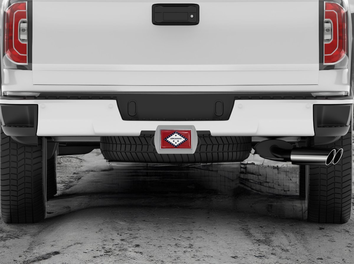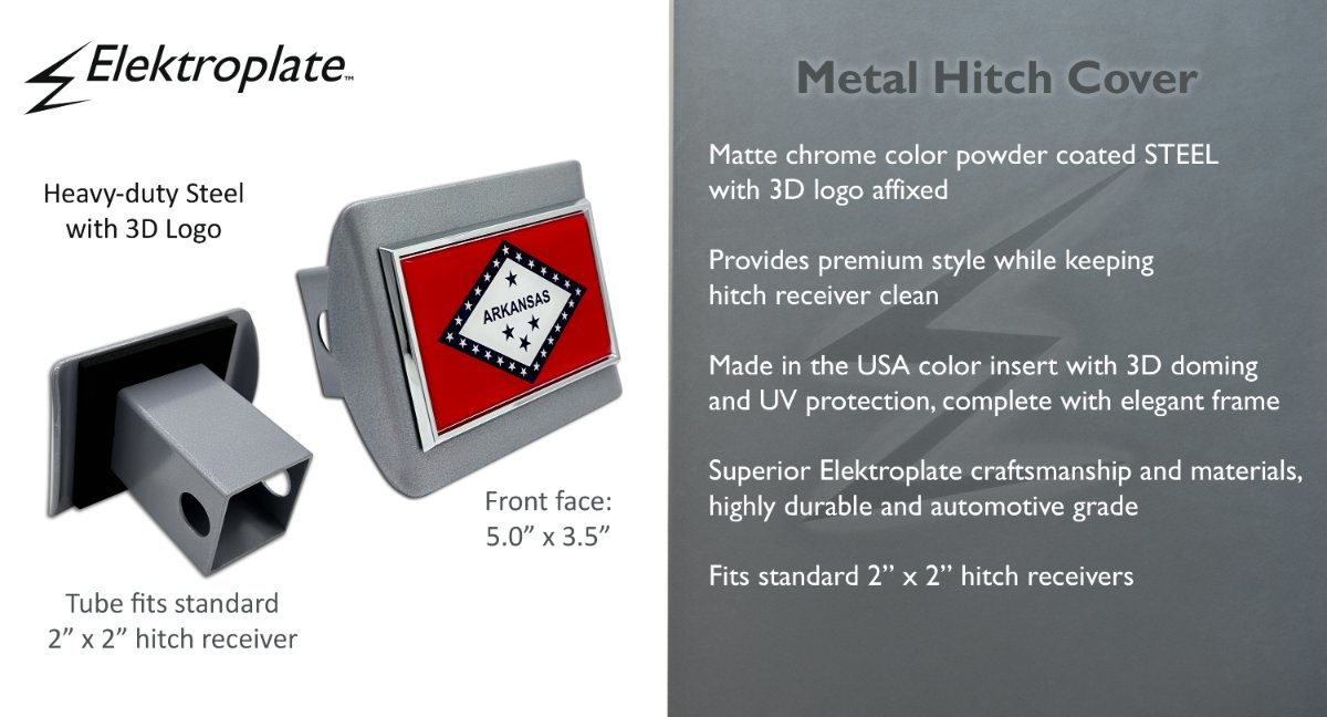 Arkansas Flag ALL-METAL Hitch Cover (Front plate measures 5” x 3.5”) by Elektroplate – a premium upgrade in both quality and appearance compared to cheaper plastic and pewter versions. Features an OEM Arkansas Flag emblem (ABS plastic core with a chrome-plated metal finish) mounted on a sleek brushed chrome all-metal hitch cover. Designed to fit all standard 2” trailer hitch receivers. If it doesn’t fit perfectly, you may return it for a full refund.