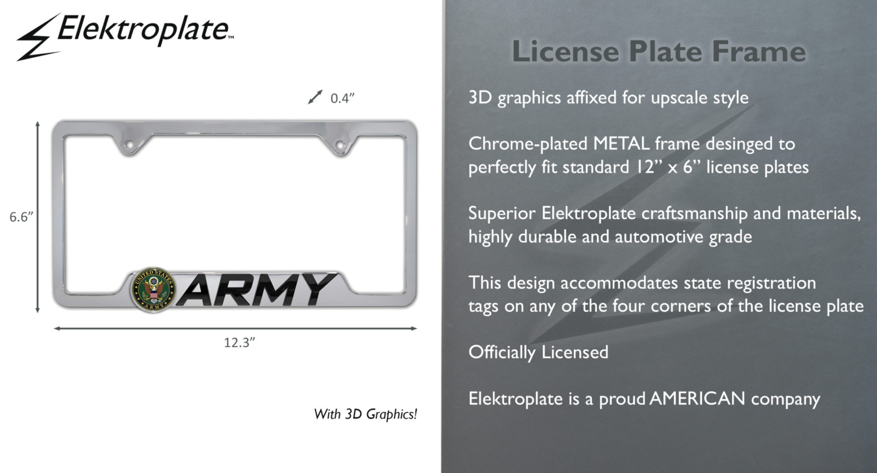 This Elektroplate license plate frame is comprised of an all-metal frame made to withstand harsh outdoor conditions. This Army license plate frame will look brand new for years to come (as opposed to cheap imitations that will fade or chip within months of being on your vehicle). Our high-end license plate frames are the perfect way to showcase your pride everywhere you drive. In addition, all Elektroplate products are packaged in elegant retail packaging to make a great gift!