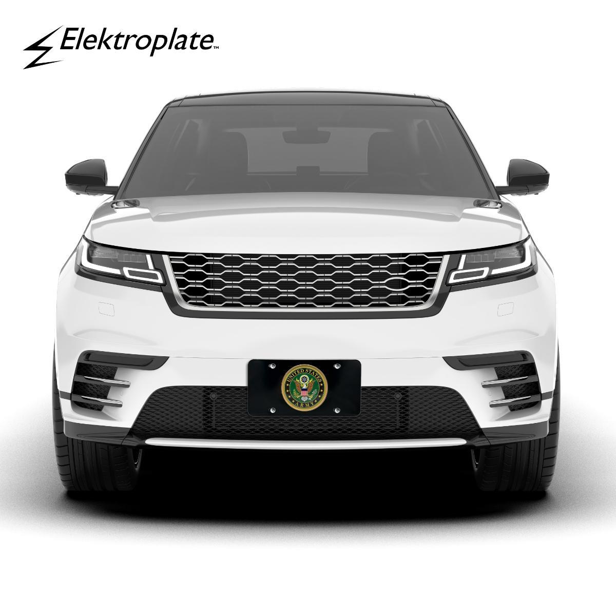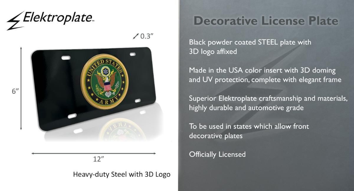 Officially licensed – U.S. Army ALL METAL front license plate (12” x 6”) by Elektroplate. Comprised of an over-sized UV protected decal with 3D doming features (Made in the USA) and an OEM frame adhered to a black all-metal license plate base.