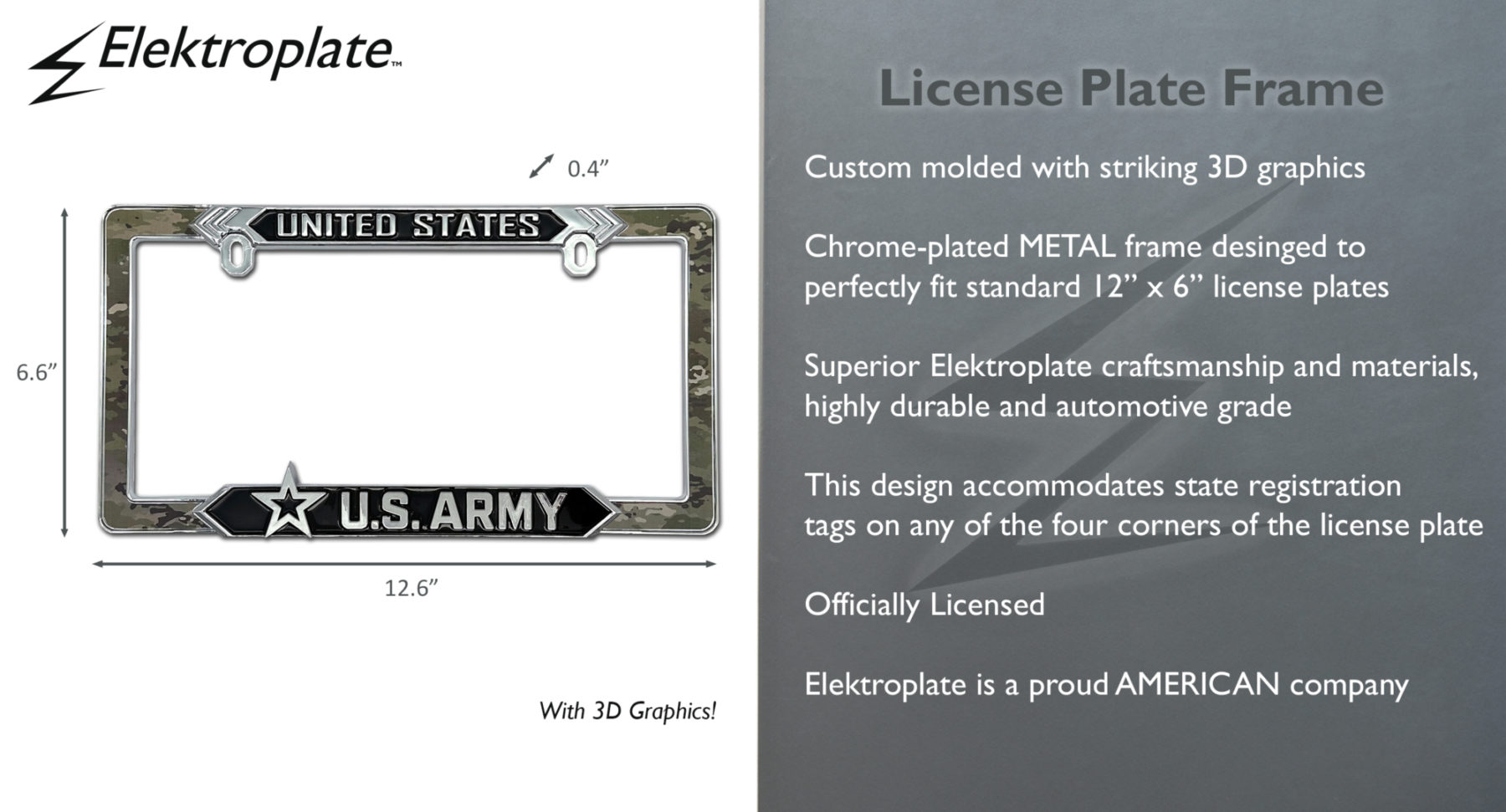 Proudly display your Army pride with this officially licensed ALL METAL license plate frame (12.6" x 6.6") by Elektroplate. Featuring bold 3D graphics and a polished, durable finish, it’s the perfect way to honor your service or support the United States Army. Built to resist fading, tarnishing, and chipping, this frame will keep its bold look for years.