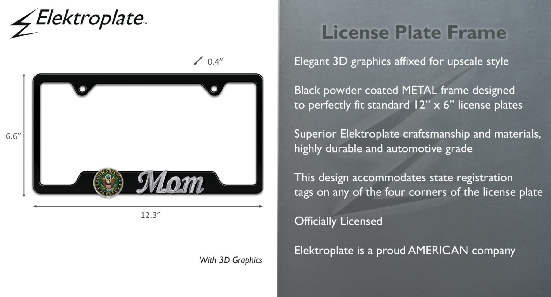 Is your son or daughter a current of former member of the United States Army and you’re looking for the perfect automotive accessory to add to your vehicle to show your pride in them? Look no further than this officially licensed – U.S. Army black metal license plate frame (12.3." x 6.6") by Elektroplate. All-metal (NOT plastic) frame with black finish, 3D script “Mom” text, and a stunning United States Army seal emblem. The Army seal emblem is comprised of a custom-molded shiny chrome frame with UV-protected full-color domed decal made to last!