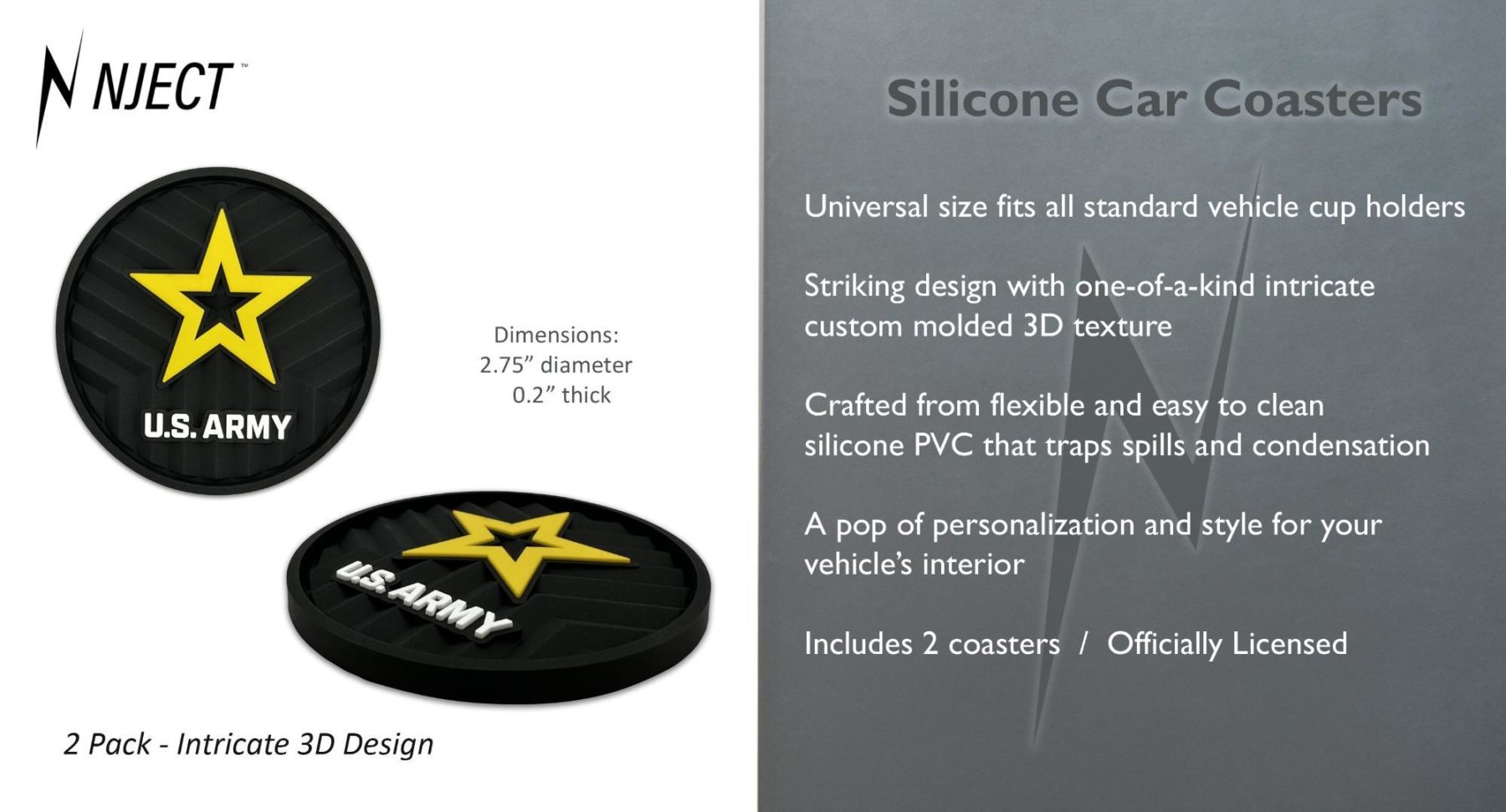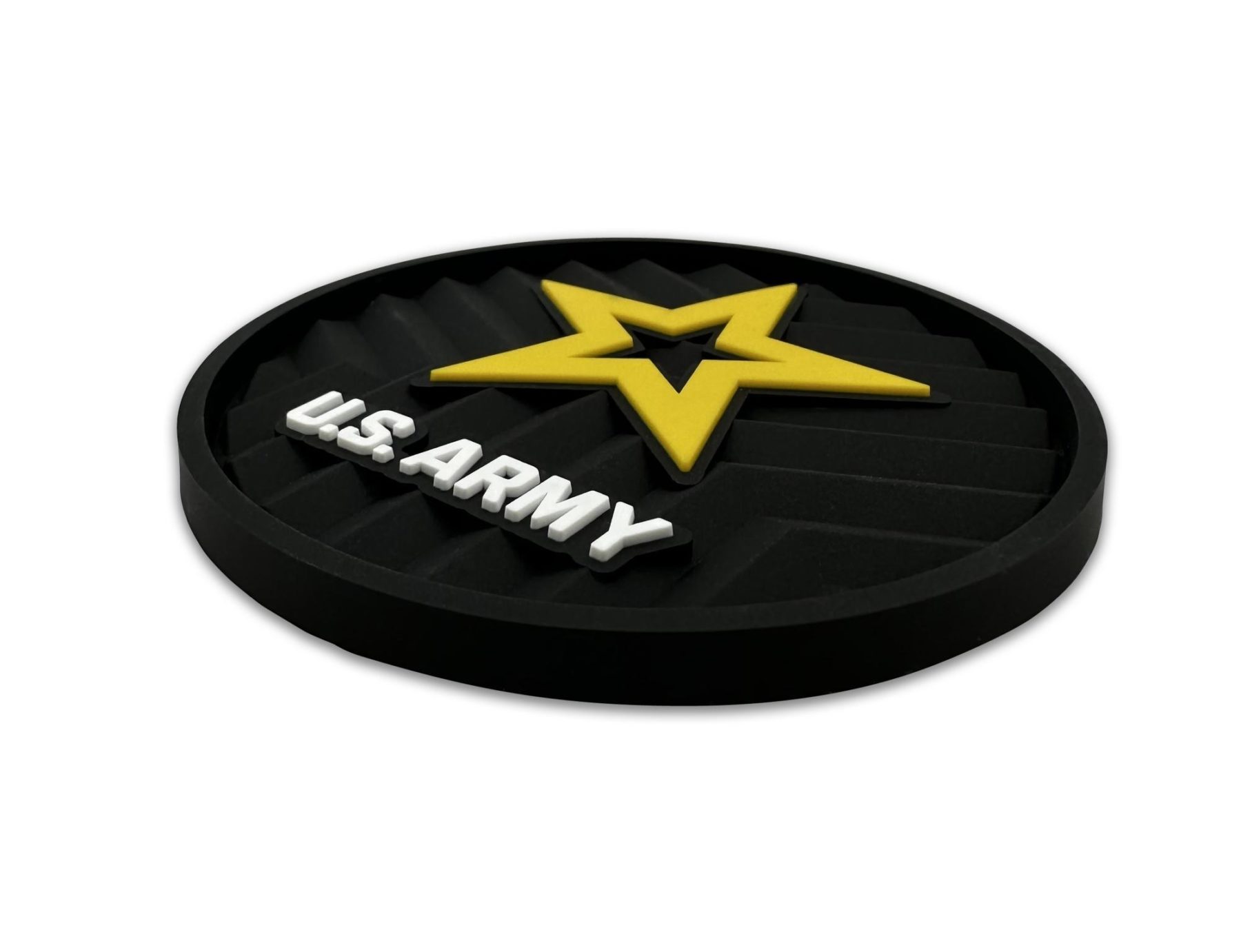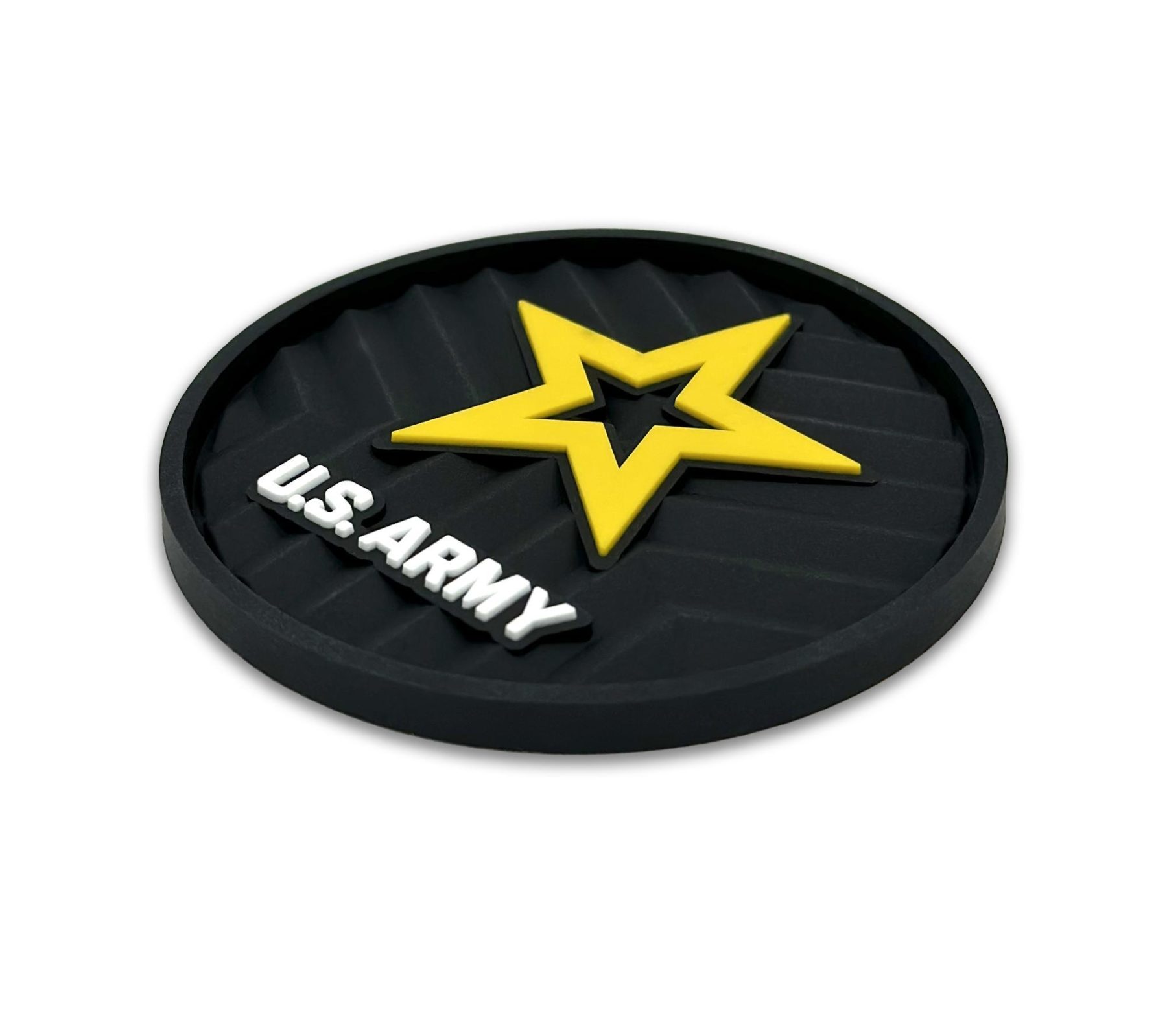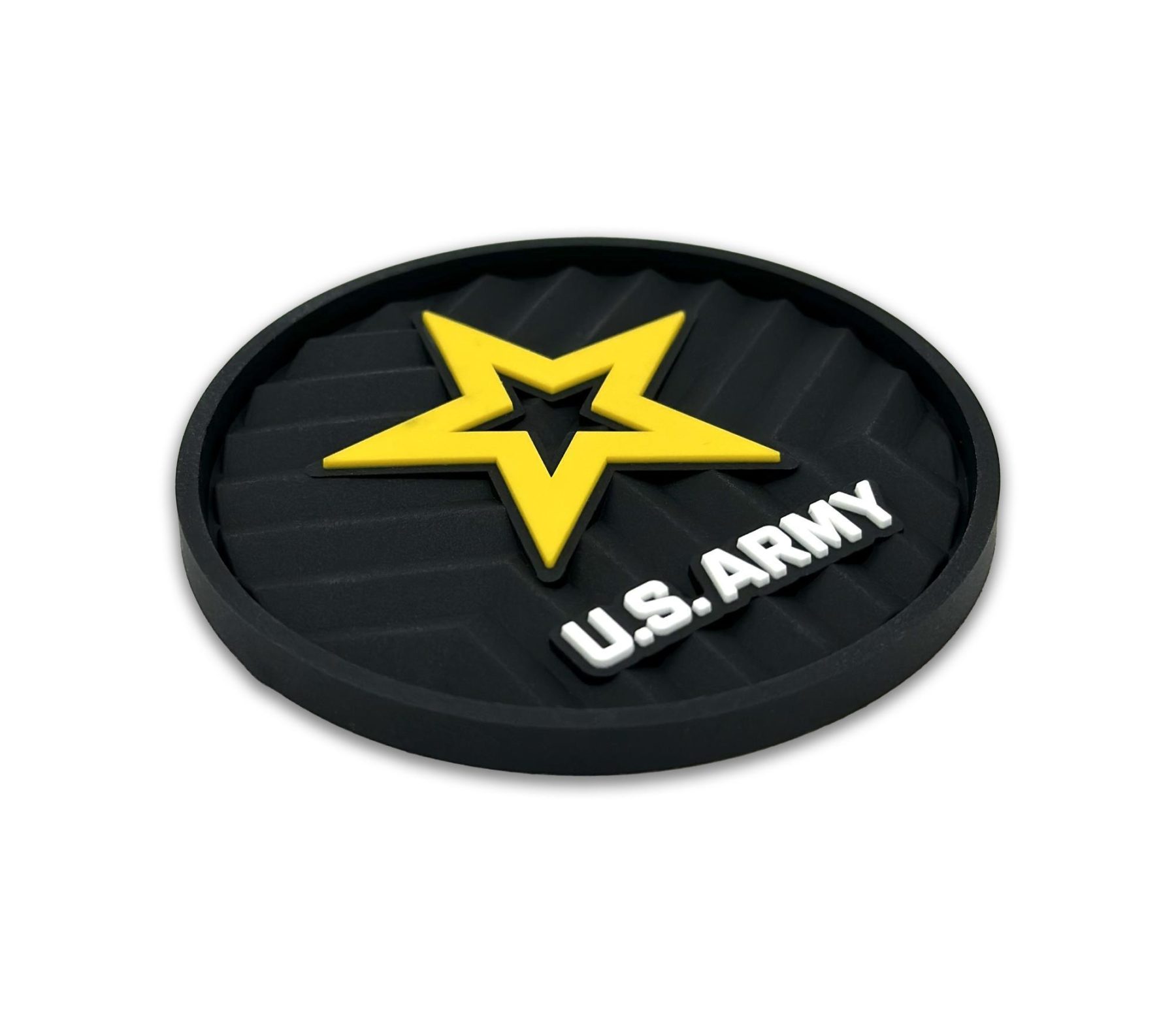 This 2-pack of silicone car coasters features the Army star design with intricate custom molded 3D texture and bold color contrast. The raised detailing adds depth, durability, and visual impact while providing a pop of personality and style to your vehicle’s interior. Designed for everyday use, these silicone cup holder coasters combine functional protection with patriotic flair in a durable automotive accessory.