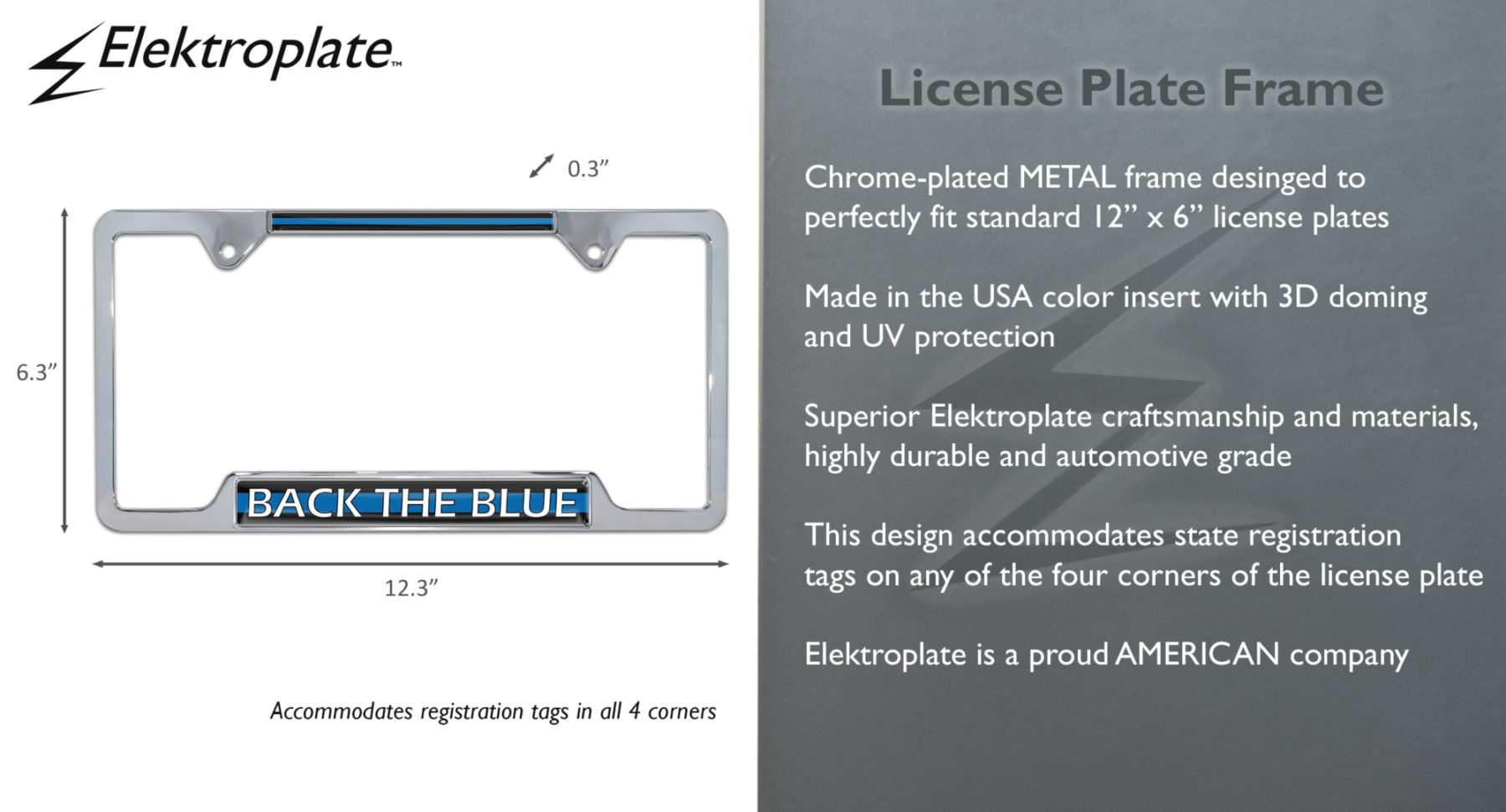 Support our first responders and heroes everywhere you drive with this Police “Back The Blue” Blue Line chrome-plated metal license plate frame (12.3" x 6.3") by Elektroplate. This high-quality all-metal frame is built to endure the elements, ensuring it remains looking brand new for years without chipping or fading. The frame features Made in the USA graphic inserts with 3D doming, vivid colors, and UV protection.