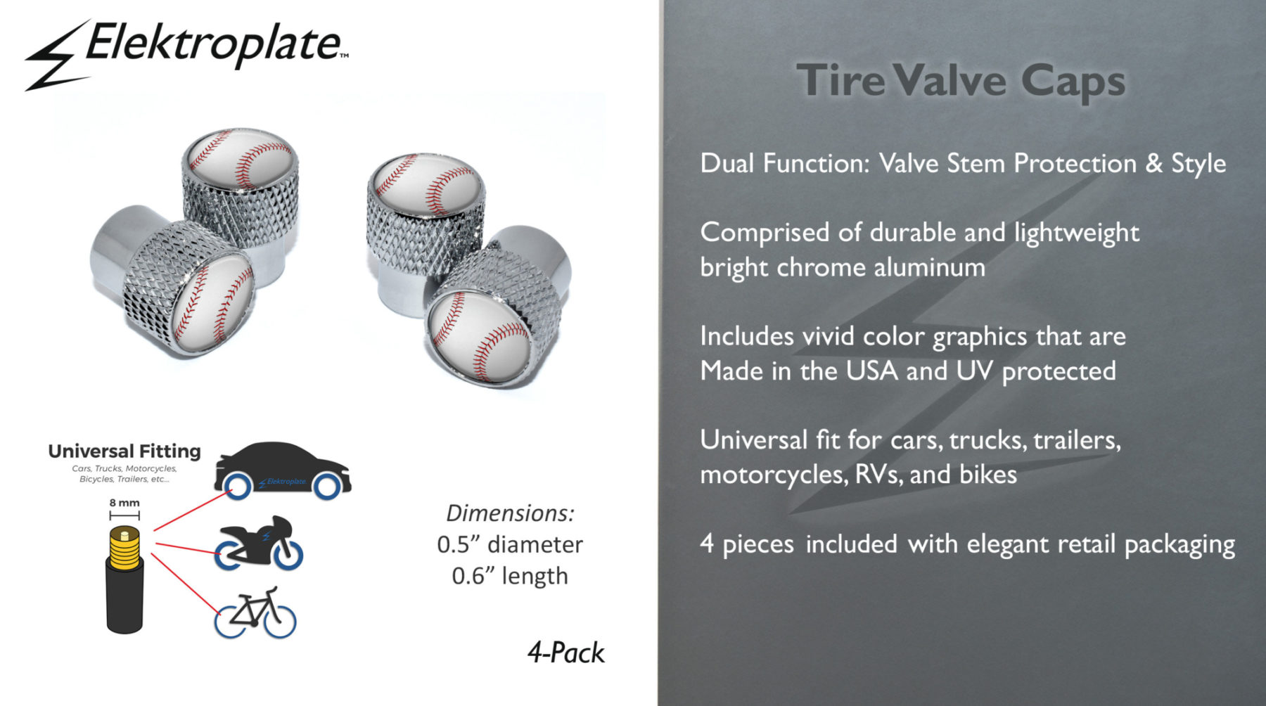 Baseball 4-Piece Bright Chrome Universal Valve Stem Caps by Elektroplate. Featuring UV-protected, scratch-resistant domed graphics made in the USA, these premium valve caps deliver both durability and a brilliant chrome shine. Each cap is made from lightweight, corrosion-resistant aluminum and includes a high-quality leakproof sealing ring to help prevent pressure loss.