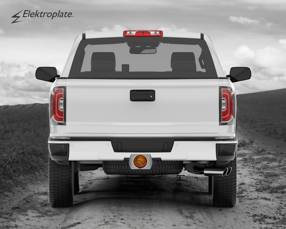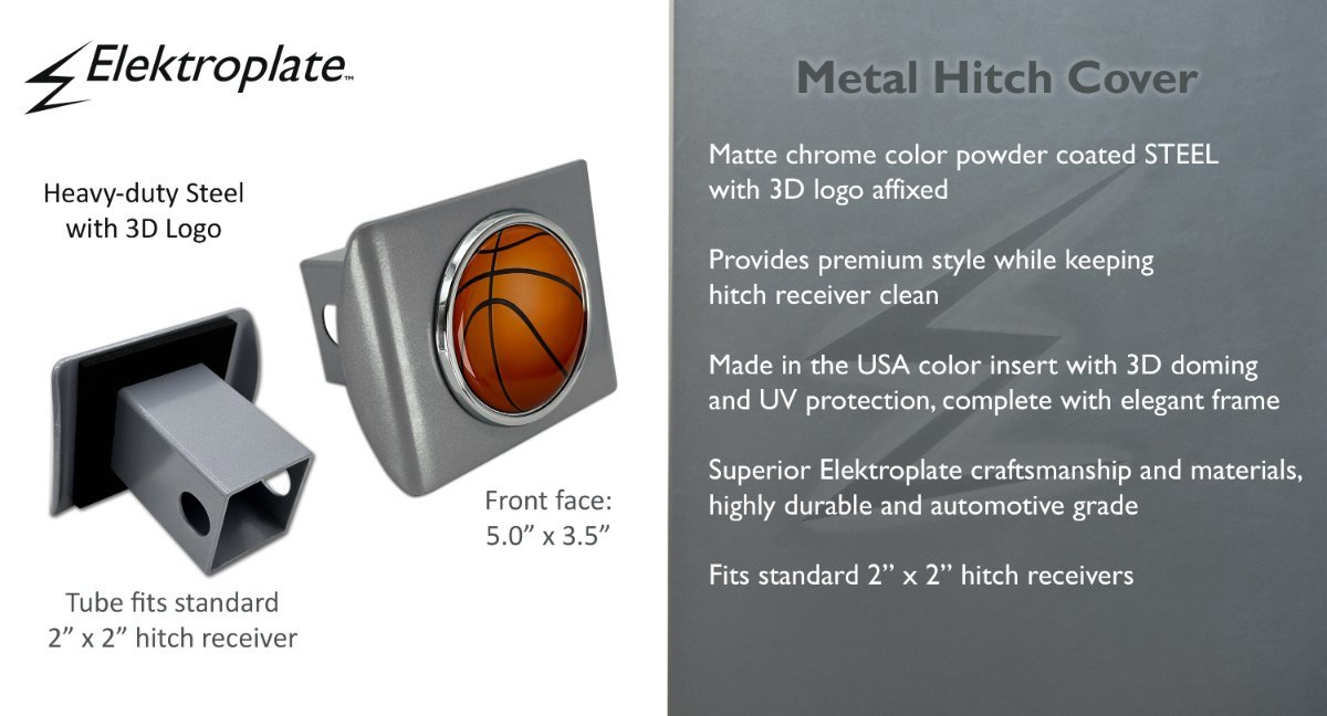 Basketball ALL-METAL hitch cover (front plate is 5” x 3.5”) by Elektroplate — a step above in quality and appearance compared to cheaper plastic and pewter versions. Features an all-metal basketball emblem securely mounted on a brushed chrome all-metal hitch cover. Fits standard 2” trailer hitch receivers (if it doesn’t fit perfectly, you may return it for a full refund).