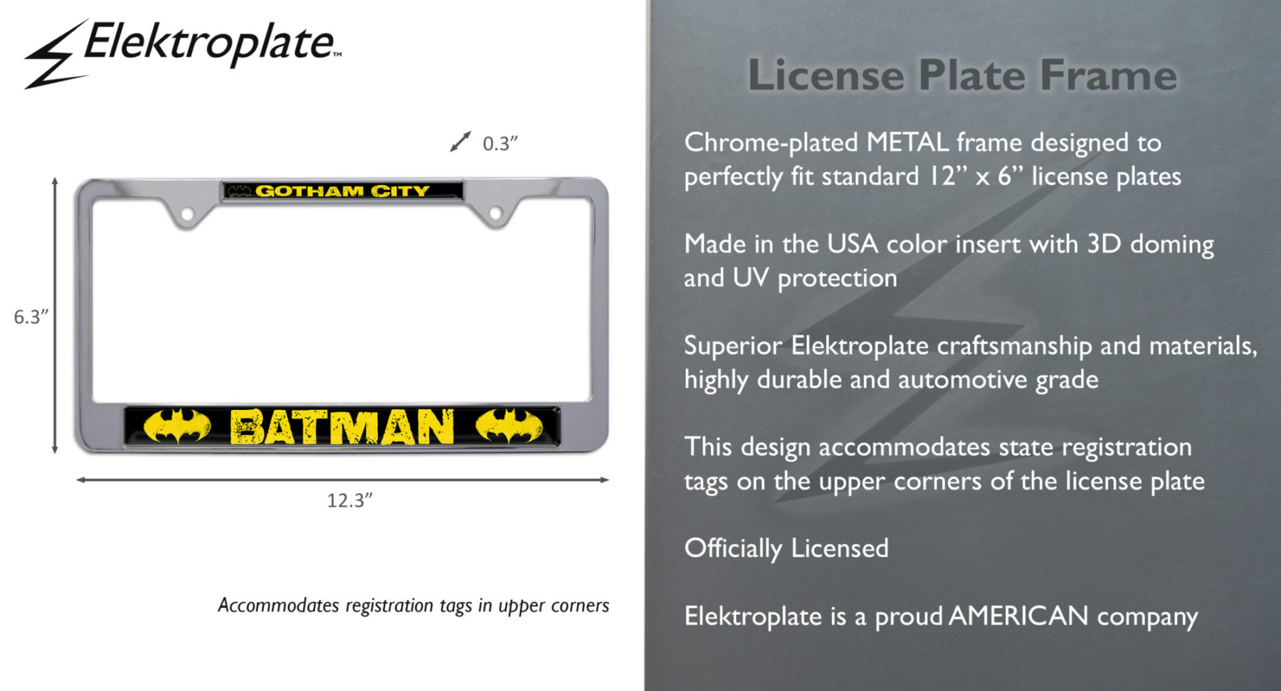 Elevate your vehicle’s style with this Officially Licensed DC Comics Batman Gotham City chrome-plated metal license plate frame (12.3" X 6.3") by Elektroplate. This high-quality all-metal frame is built to endure the elements, ensuring it remains looking brand new for years without chipping or fading. The frame features Made in the USA graphic inserts with 3D doming, vivid colors, and UV protection.