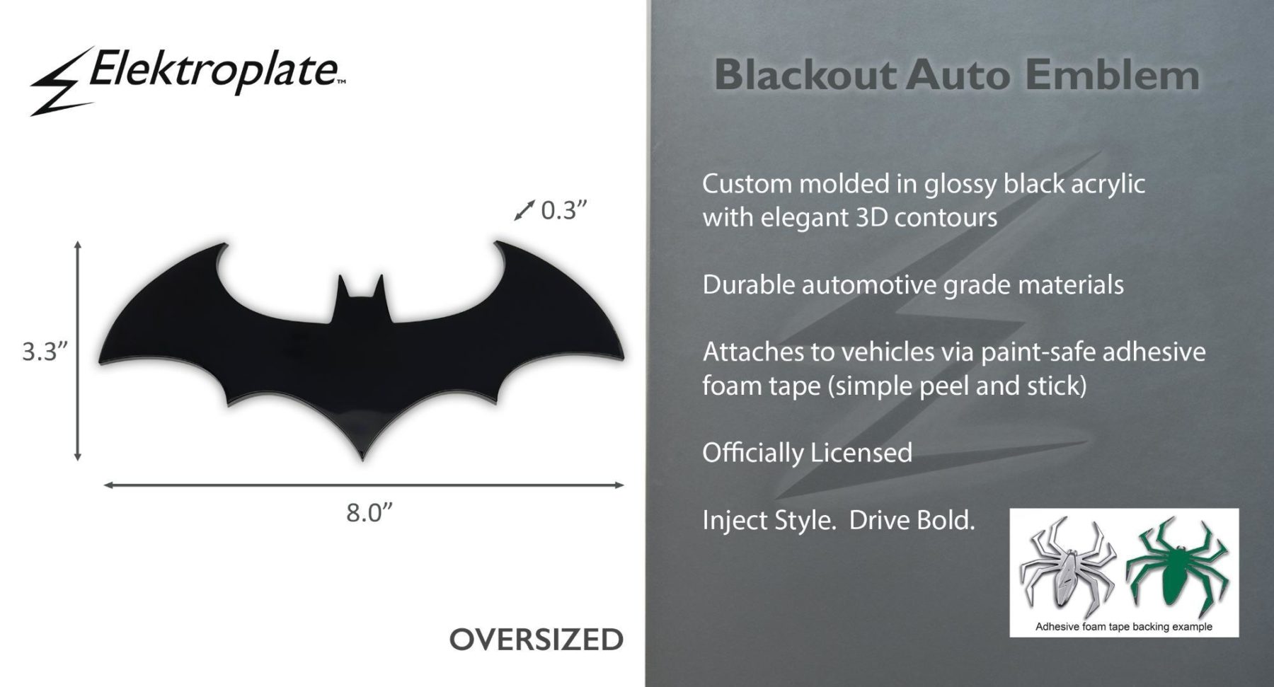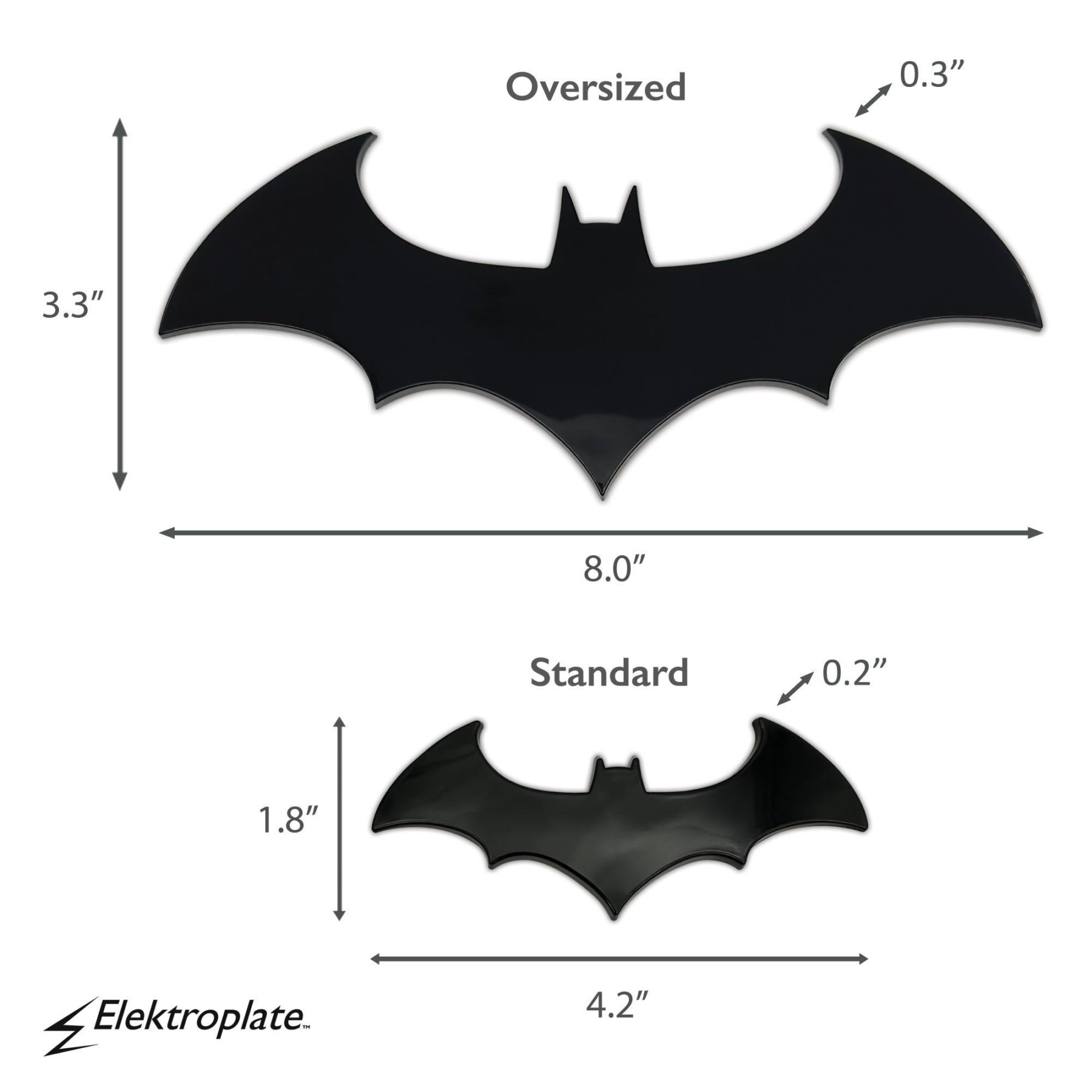Make a bold statement with this officially licensed Batman oversized black 3D auto emblem, designed for maximum visual impact. Featuring the iconic Dark Knight logo in a sleek blackout finish, this large emblem measures approximately 8 inches wide, making it significantly bigger than standard badges for a standout look on any vehicle. Crafted from high-quality glossy black acrylic with raised 3D contours, this emblem delivers a modern, stealth-inspired aesthetic perfect for Batman fans and automotive enthusiasts alike.