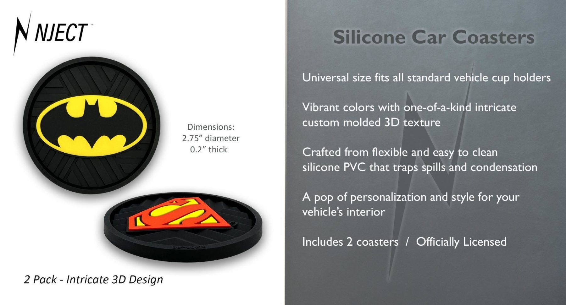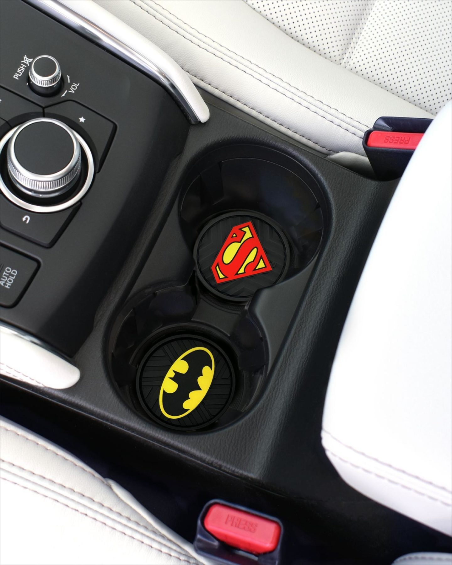 This 2-pack of silicone car coasters features vibrant colors and intricate custom molded 3D texture showcasing iconic Batman and Superman designs. The raised details add depth and durability while providing a bold pop of personalization and style to your vehicle’s interior. Designed for daily driving, these silicone cup holder coasters combine practical function with eye-catching DC Comics style in a durable automotive accessory.
