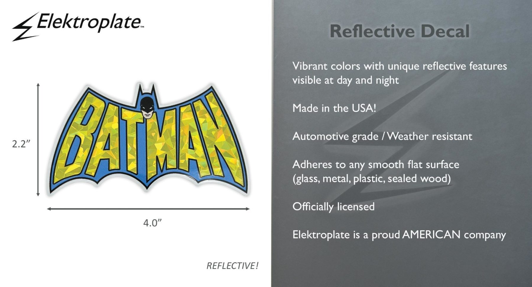 Capture the essence of classic superhero design with this Batman Vintage Blue and Yellow reflective decal. Measuring approximately 4.0 inches wide by 2.2 inches tall, this decal is ideal for vehicles, laptops, and accessories. The reflective finish ensures visibility at night while maintaining bold color in daylight.