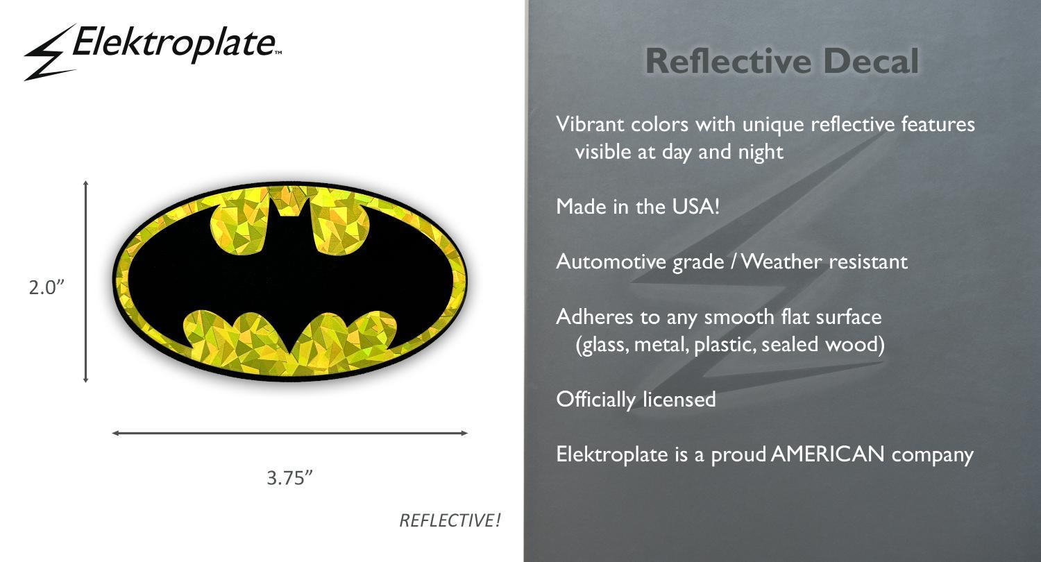 Officially licensed - Batman reflective decal - TM & © DC Comics (3.75" x 2") by Elektroplate. Comprised of UV-protected reflective material, Made in the USA. All Elektroplate reflective decals are extremely visible indoors and outdoors, which makes them perfect for any of the following applications: