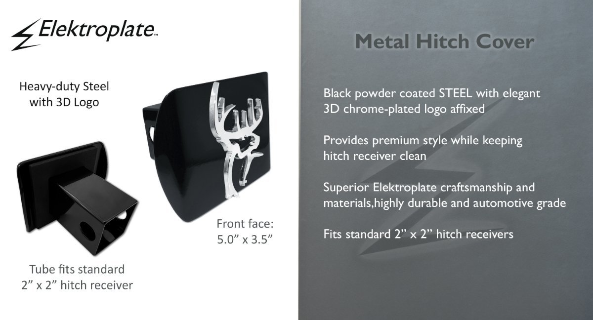 Officially licensed Buck Commander ALL-METAL hitch cover (front plate is 5” x 3.5”) by Elektroplate. A step above in quality and appearance compared to plastic and pewter versions. Features an all-metal Buck emblem securely adhered to a black all-metal hitch cover mount. Fits standard 2” trailer hitch receivers (if it doesn’t fit perfectly, you may return it for a full refund).