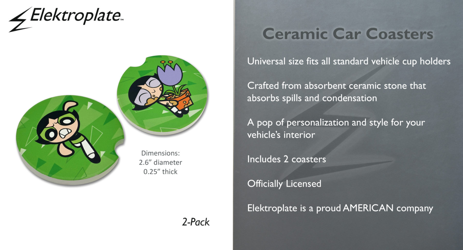 Add some tough-girl attitude to your car with these Officially Licensed Powerpuff Girls Buttercup car coasters (Set of 2) from Elektroplate! Each set includes two unique, absorbent coasters designed to keep your cup holders dry and clean. Featuring Buttercup, the fearless and spirited Powerpuff Girl, these coasters offer a universal fit (2.6" diameter) for most vehicle cup holders. Durable, practical, and packed with Buttercup’s bold energy, they’re the perfect accessory for fans who want to add a little extra power to their ride. Whether you’re saving the day or just cruising around, these coasters are a must-have for any Buttercup fan!
