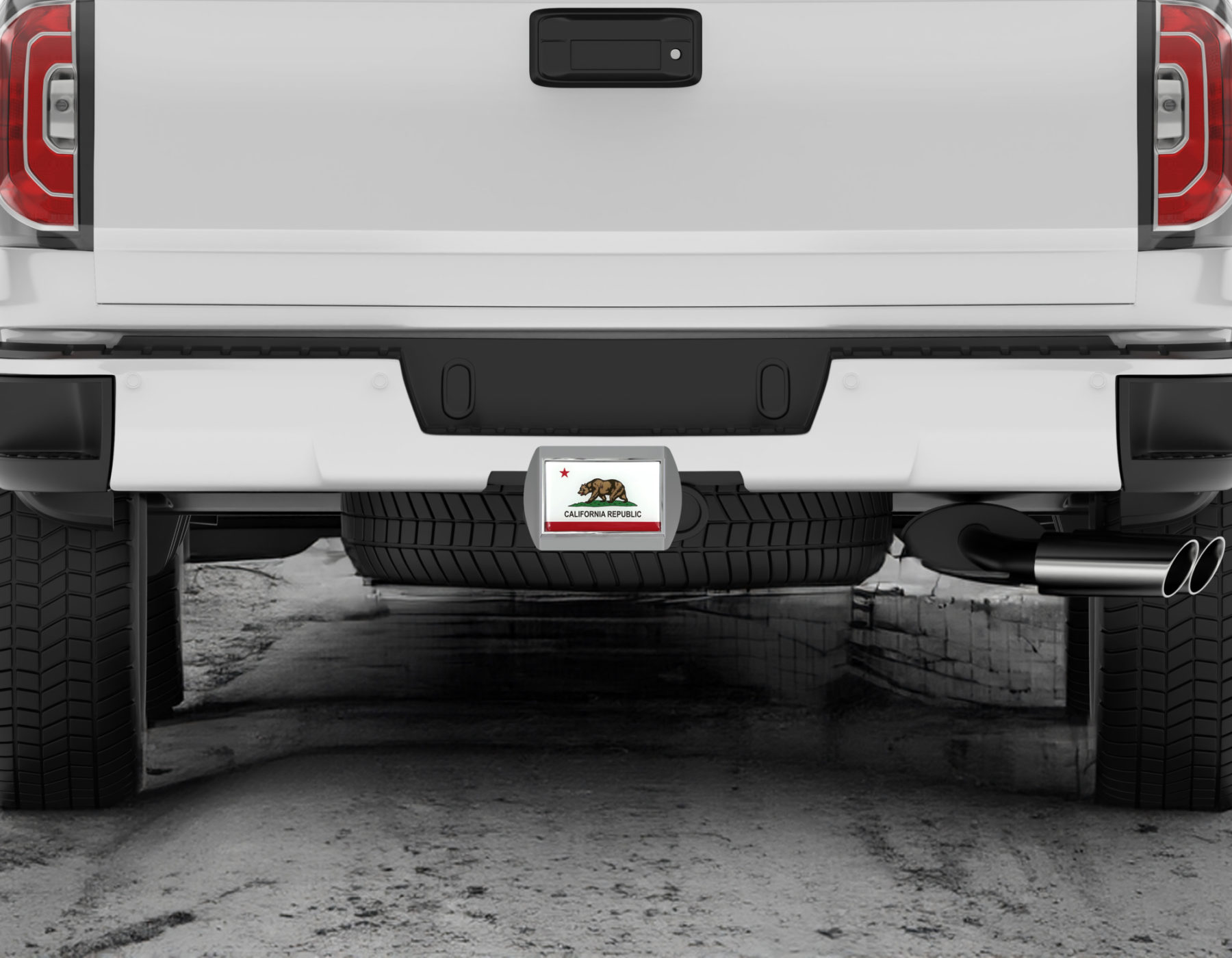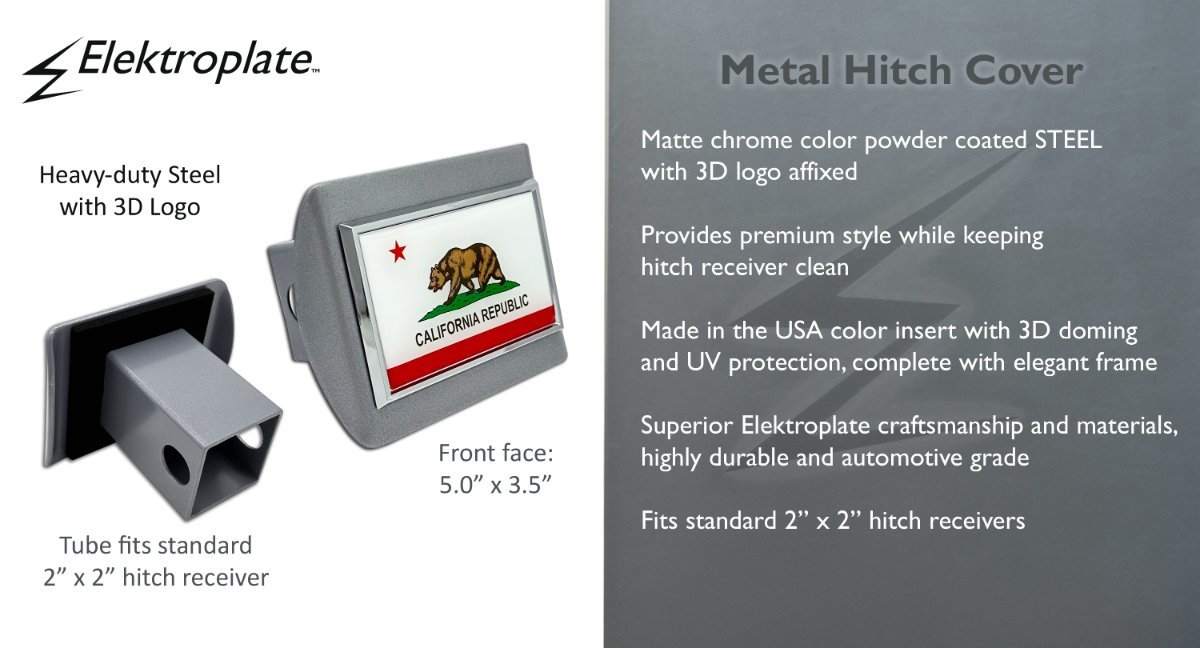 California State Flag ALL-METAL Hitch Cover (front plate: 5” x 3.5”) by Elektroplate — a premium, eye-catching accessory that outperforms cheaper plastic and pewter alternatives. Featuring a detailed OEM-quality California Flag emblem (ABS plastic core with a chrome-plated metal finish) securely affixed to a durable brushed chrome all-metal hitch cover mount. Designed to fit all standard 2” trailer hitch receivers — and if it’s not a perfect fit, you’re covered with a full refund.