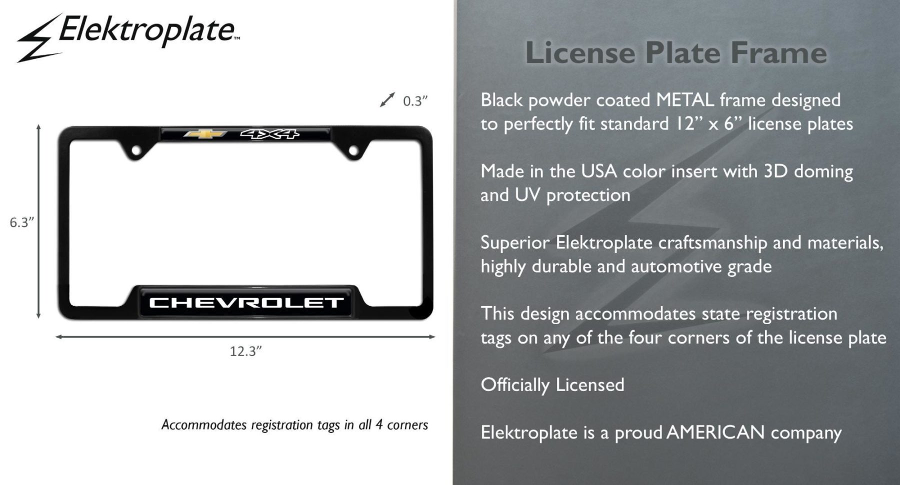 Engineered with durable, automotive grade materials, this Elektroplate license plate frame is built for long-lasting performance on and off the road. Standard frames accommodate registration tags on all four corners, while open frames offer a streamlined look with tag access on the upper corners. Perfect for Chevrolet 4x4 truck owners, this officially licensed frame is a bold exterior upgrade for any off-road enthusiast.