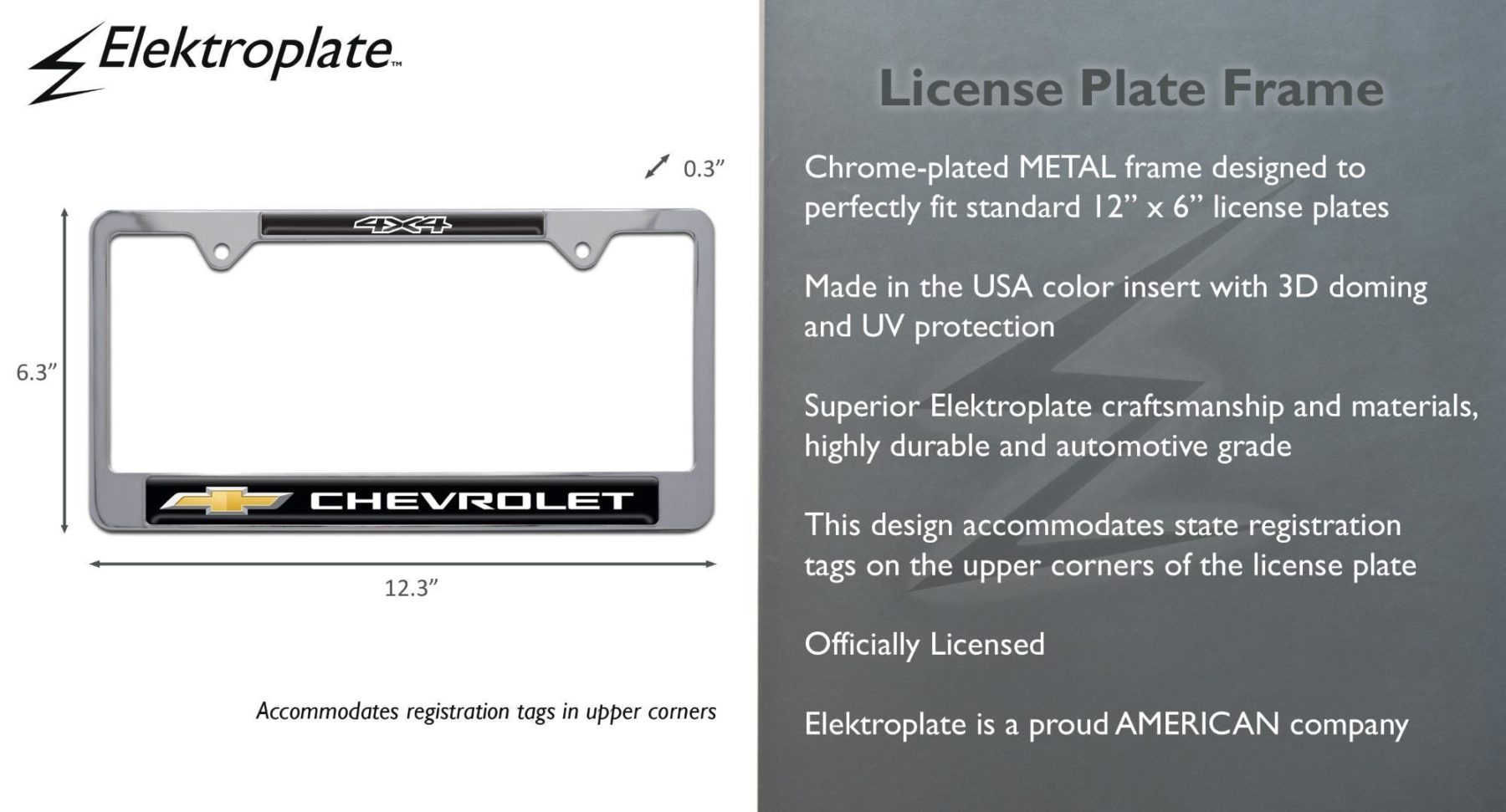 Engineered with durable, automotive grade materials, this Elektroplate license plate frame is built for long-lasting performance on and off the road. Standard frames accommodate registration tags on all four corners, while open frames offer a streamlined look with tag access on the upper corners. Perfect for Chevrolet 4x4 truck owners, this officially licensed frame is a bold exterior upgrade for any off-road enthusiast.