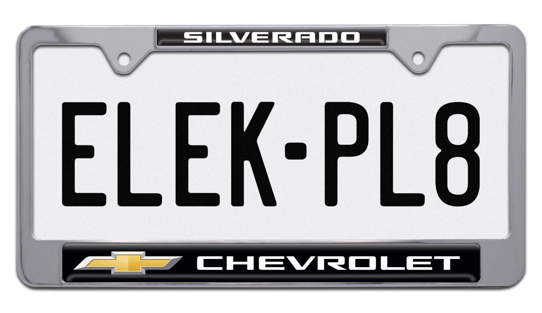 Showcase your truck with this officially licensed Chevy Silverado license plate frame from Elektroplate, designed specifically for Silverado owners who want a clean, premium look. Crafted from durable metal with black powder coated or chrome plated finishes, this frame fits standard 12 x 6 inch license plates. The 3D domed insert is proudly made in the USA and features UV protection to help prevent fading and wear, keeping your Silverado looking sharp in all conditions.