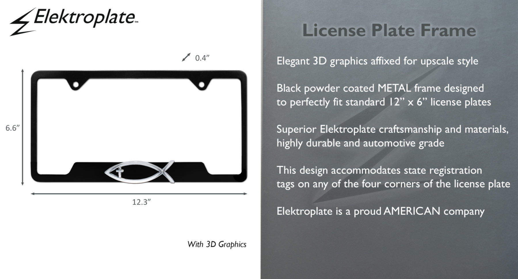 All Elektroplate license plate frames are comprised of an all-metal frame with a powder coated finish made to withstand harsh outdoor conditions. This Christian Fish license plate frame will look brand new for years to com.