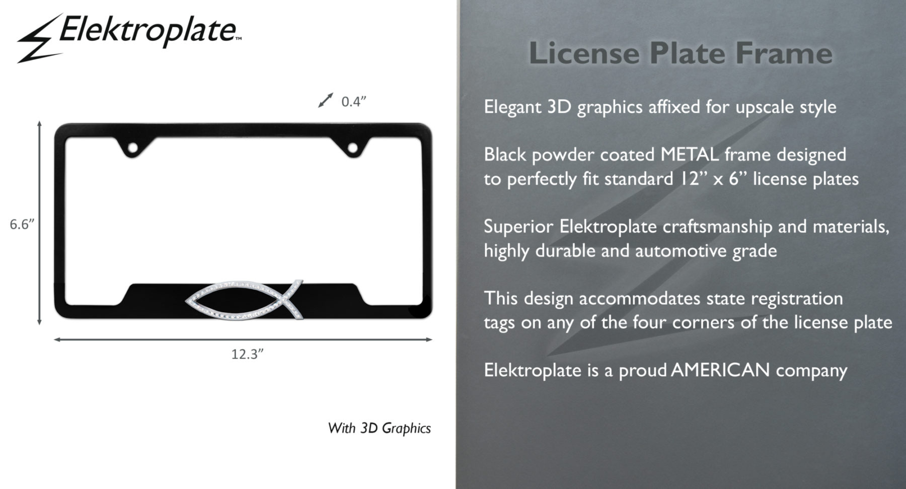 All Elektroplate license plate frames are comprised of an all-metal frame with a powder coated finish made to withstand harsh outdoor conditions. This Christian Fish license plate frame will look brand new for years to come (as opposed to cheap imitations that will fade or chip within months of being on your vehicle).