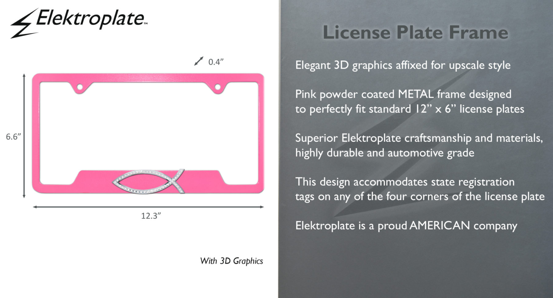Christian Fish license plate frame (12.3" x 6.6") by Elektroplate. All-metal (NOT plastic) heavy duty pink powder coated license plate frame with a shiny 3D chrome emblem inlaid with 53 crystals adhered.