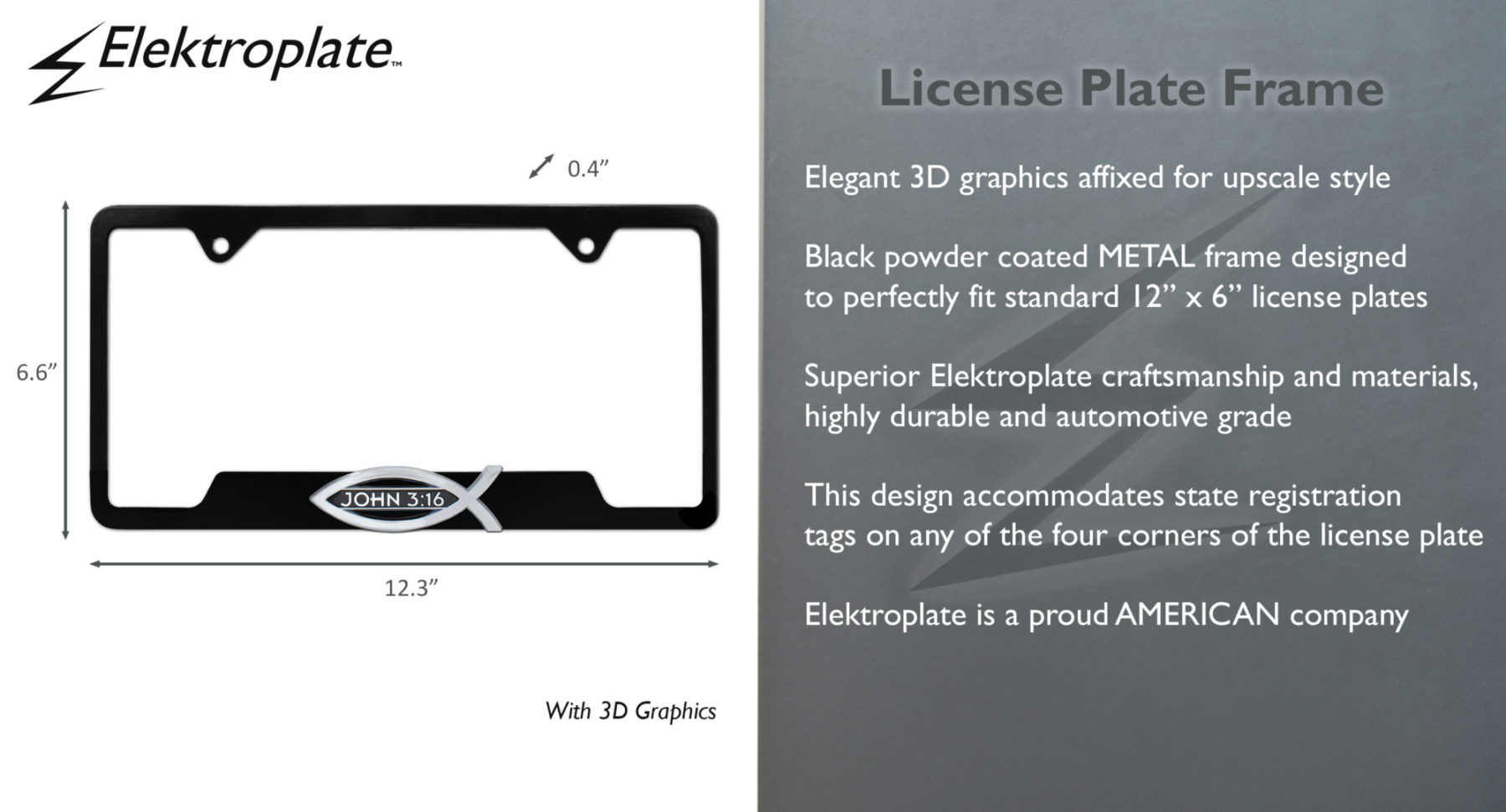 "John 3:16" Christian Fish license plate frame (12.3" x 6.6") by Elektroplate. All-metal (NOT plastic) frame with a heavy-duty black powder coat finish with a shiny 3D chrome emblem adhered.