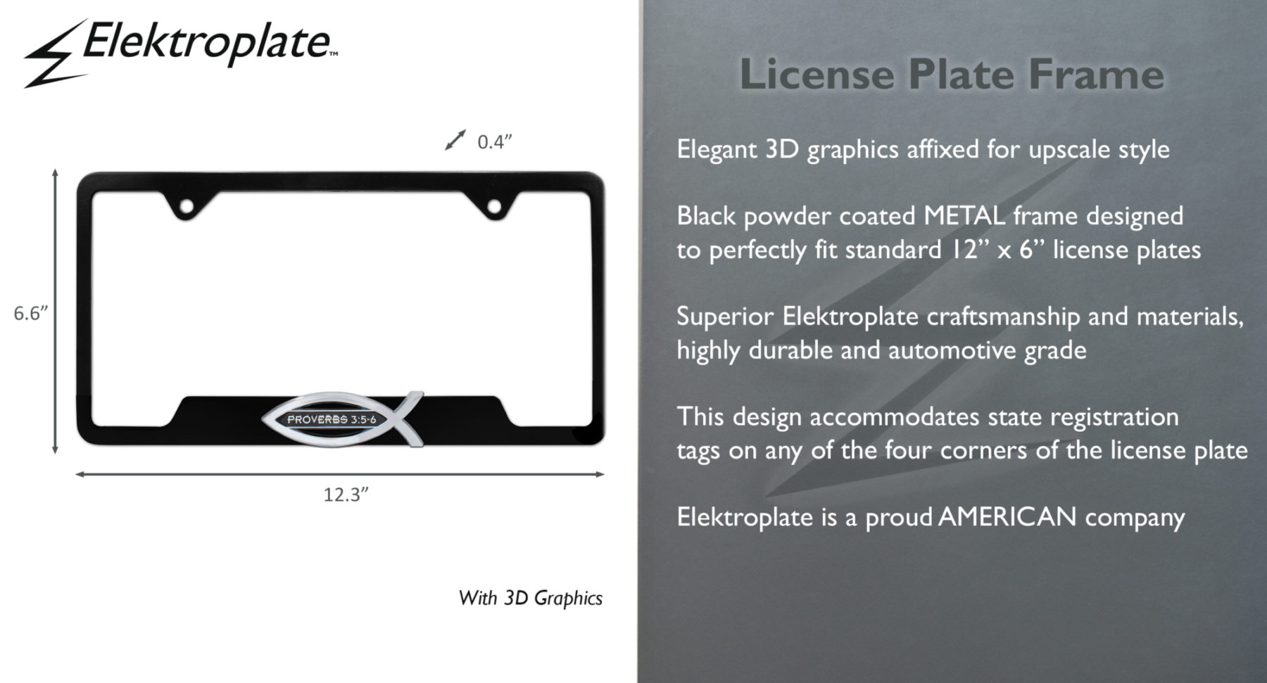 "Proverbs 3:5-6" Christian Fish license plate frame (12.3" x 6.6") by Elektroplate. All-metal (NOT plastic) frame with a heavy-duty black powder coat finish with a shiny 3D chrome emblem adhered.