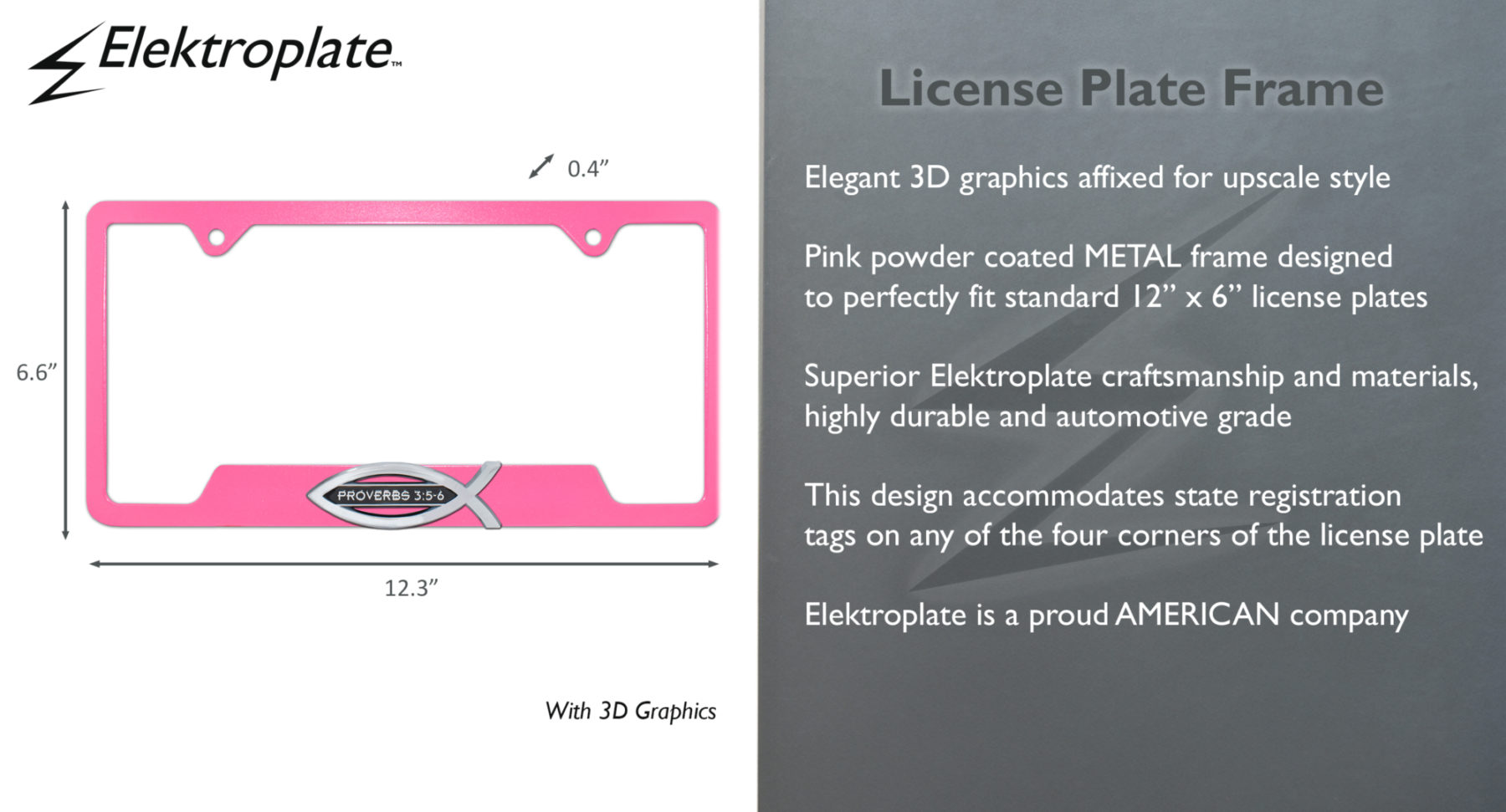 "Proverbs 3:5-6" Christian Fish license plate frame (12.3" x 6.6") by Elektroplate. All-metal (NOT plastic) frame with a heavy-duty pink powder coat finish with a shiny 3D chrome emblem adhered.