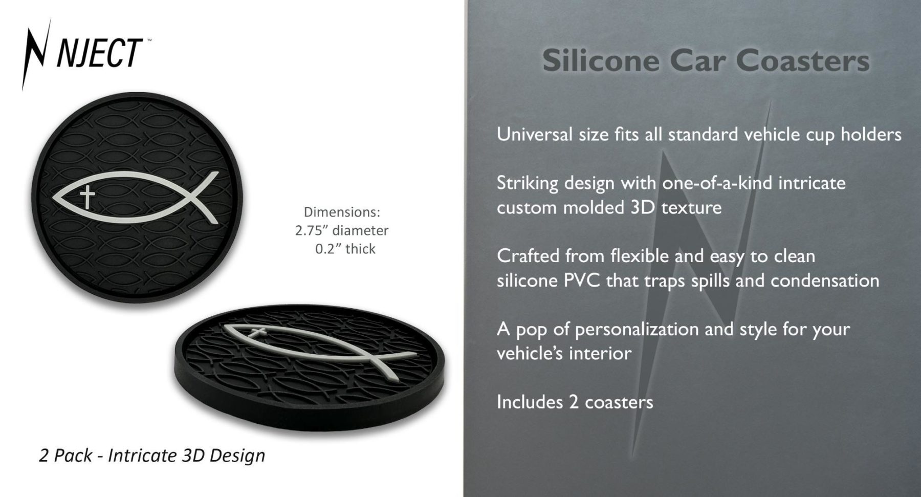 This 2-pack of silicone car coasters features a faith inspired design with intricate custom molded 3D texture and bold color contrast. The raised detailing adds depth, durability, and visual impact while providing a pop of personality and style to your vehicle’s interior. Designed for everyday use, these silicone cup holder coasters combine functional protection with style in a durable automotive accessory.