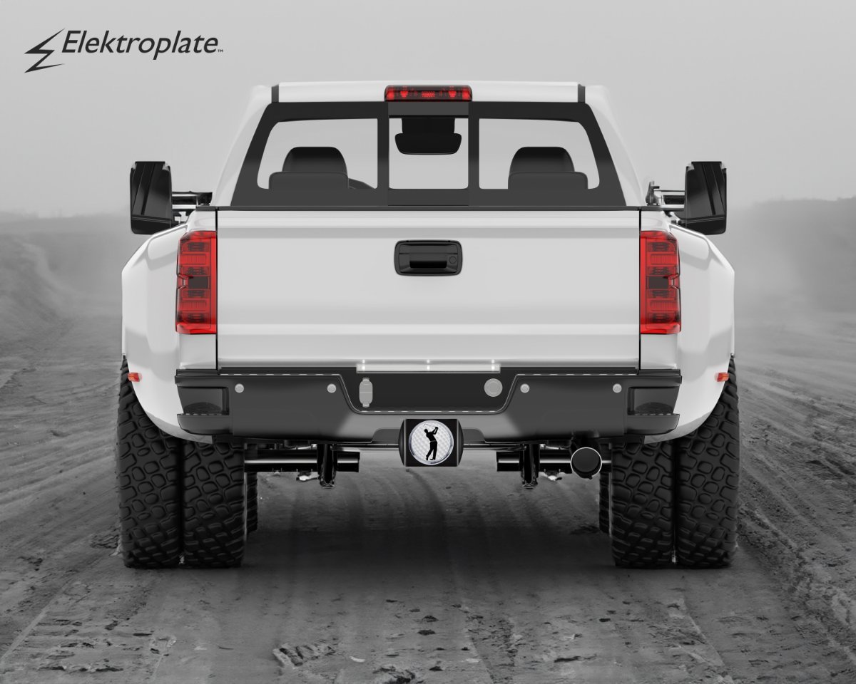 Golf ALL-METAL hitch cover (front plate is 5” x 3.5”) by Elektroplate — a step above in quality and appearance compared to cheaper plastic and pewter versions. Features a Golf emblem with an OEM ABS plastic core and chrome-plated metal finish, securely mounted on a black all-metal hitch cover. Fits standard 2” trailer hitch receivers (if it doesn’t fit perfectly, you may return it for a full refund).