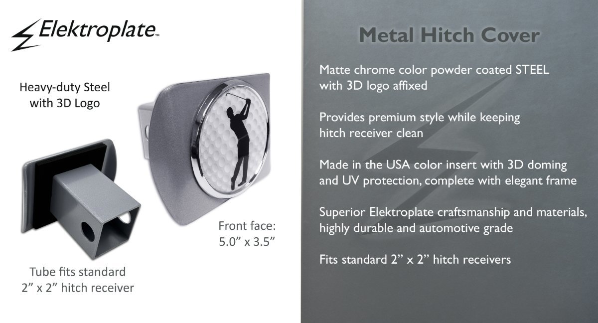 Golf ALL-METAL hitch cover (front plate is 5” x 3.5”) by Elektroplate — a step above in quality and appearance compared to cheaper plastic and pewter versions. Features a Golf emblem with an OEM ABS plastic core and chrome-plated metal finish, securely mounted on a brushed all-metal hitch cover. Fits standard 2” trailer hitch receivers (if it doesn’t fit perfectly, you may return it for a full refund).