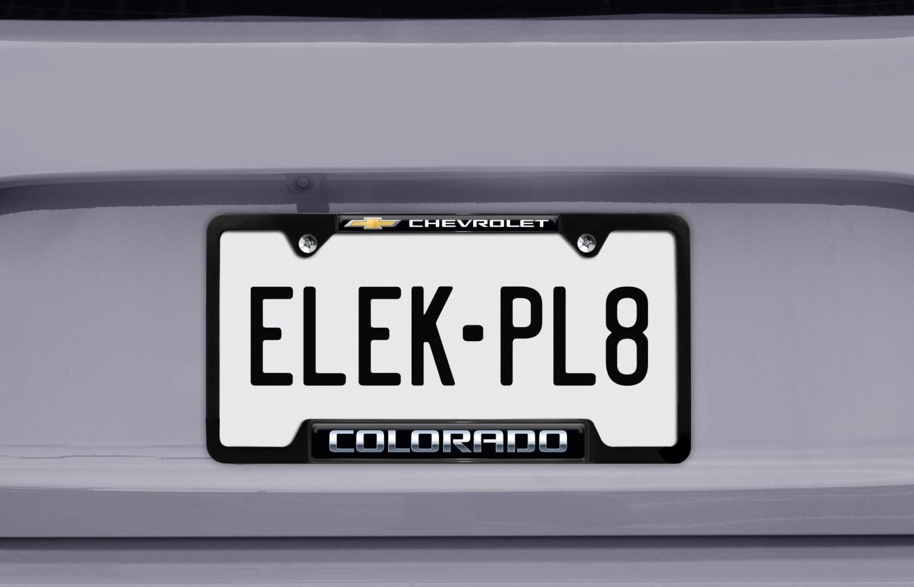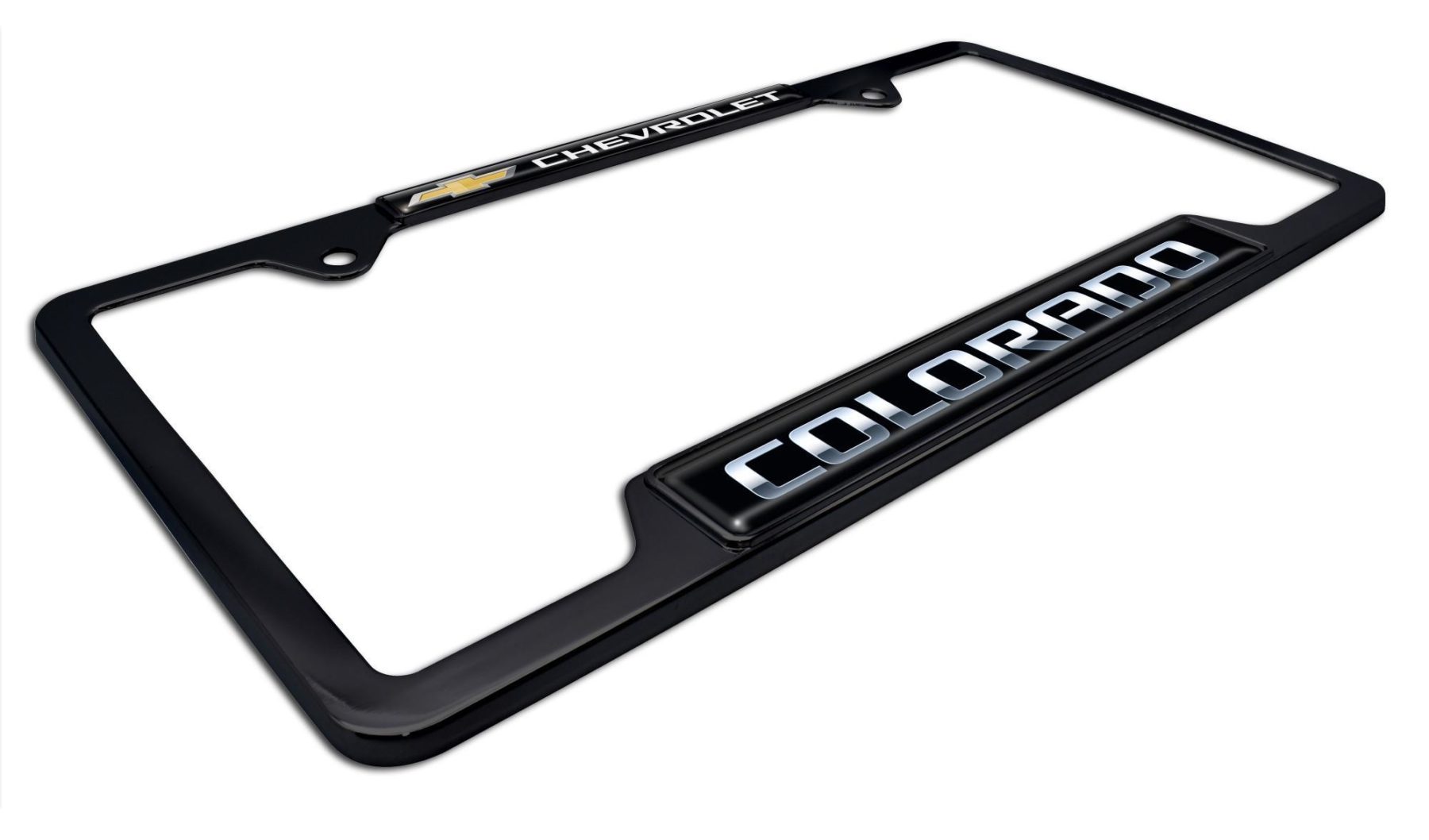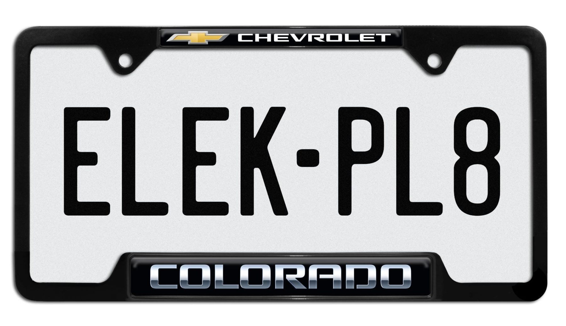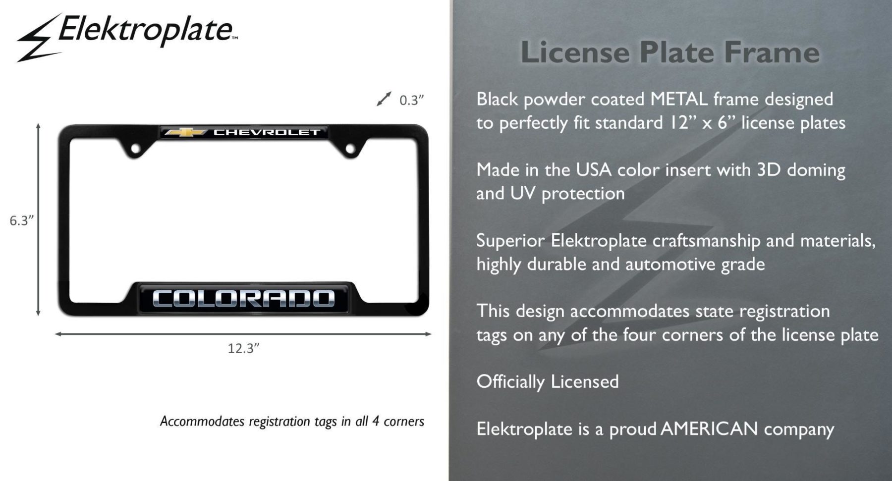 Complete your truck’s look with this officially licensed Colorado Chevy license plate frame from Elektroplate. Designed to fit standard 12 x 6 inch license plates, this metal frame is available in black powder coated or chrome plated finishes. The premium 3D domed insert is made in the USA and protected with UV coating to ensure long-lasting clarity and durability.