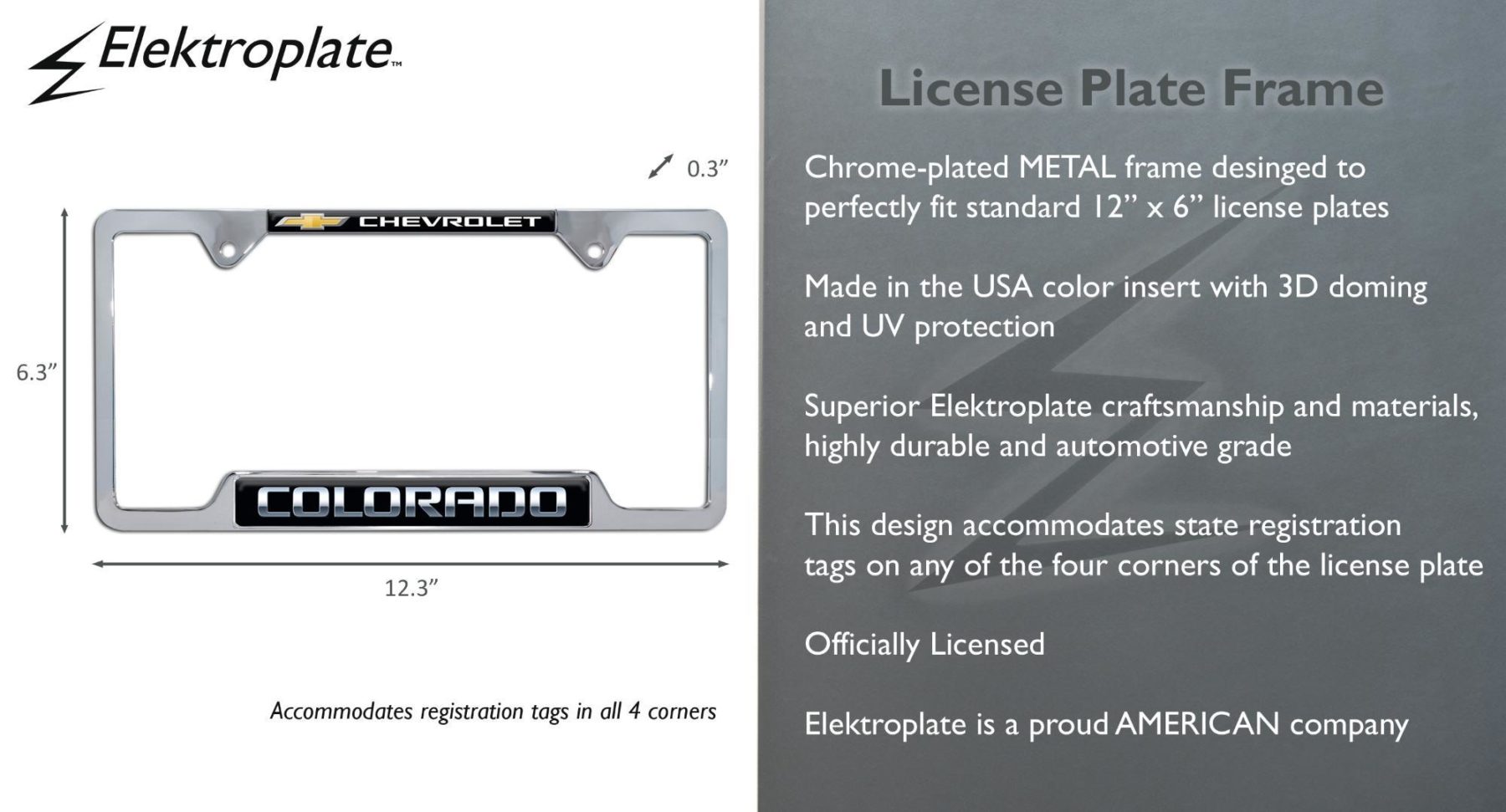 Complete your truck’s look with this officially licensed Colorado Chevy license plate frame from Elektroplate. Designed to fit standard 12 x 6 inch license plates, this metal frame is available in black powder coated or chrome plated finishes. The premium 3D domed insert is made in the USA and protected with UV coating to ensure long-lasting clarity and durability.