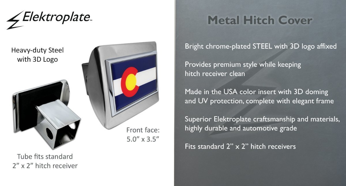 Colorado State Flag ALL-METAL Hitch Cover (front plate: 5” x 3.5”) by Elektroplate — a premium upgrade in both quality and appearance over cheaper plastic and pewter versions. Features an OEM-style Colorado State Flag emblem (ABS plastic core with a black metal finish) mounted on a shiny chrome all-metal hitch cover base. Fits all standard 2” trailer hitch receivers — and if it doesn’t fit perfectly, you may return it for a full refund.