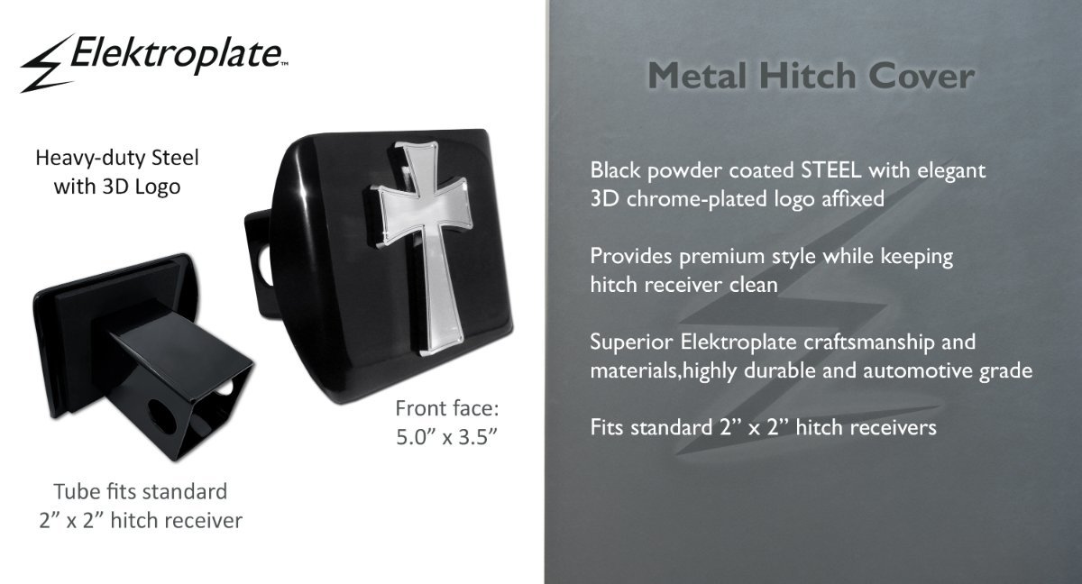 Cross Tapered ALL-METAL hitch cover (front plate is 5” x 3.5”) by Elektroplate. A step above in quality and appearance compared to plastic and pewter versions. Features a chrome-plated metal Cross emblem securely adhered to a black all-metal hitch cover mount. Fits standard 2” trailer hitch receivers — if it doesn’t fit perfectly, you may return it for a full refund.