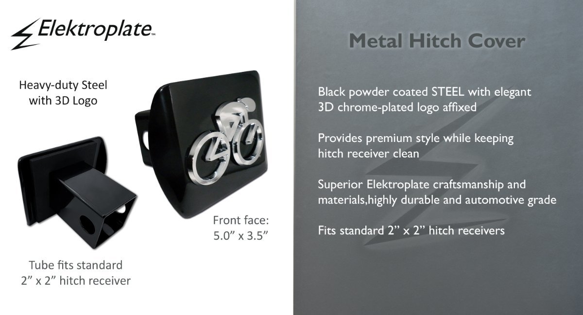 Celebrate your passion for cycling with the premium Cycling All-Metal Hitch Cover by Elektroplate. Engineered for both durability and style, this high-quality hitch cover features an OEM-style emblem—crafted with an ABS plastic core and chrome-plated metal finish—securely mounted on a sleek black all-metal base. The front plate measures 3.5” x 5” and is designed to fit standard 2” trailer hitch receivers. If it doesn’t fit perfectly, you’re backed by a full refund guarantee.