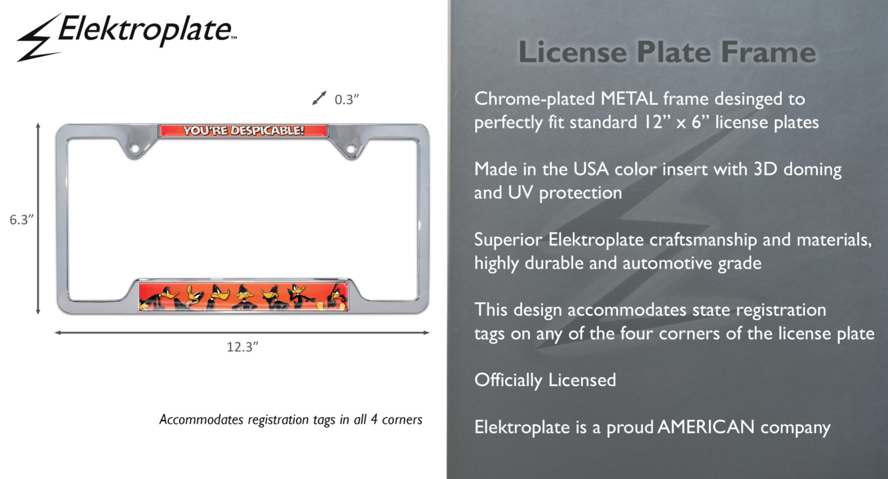 Elevate your vehicle’s style with this Officially Licensed Looney Tunes Daffy Duck "You're Despicable" chrome-plated metal license plate frame (12.3" x 6.3") by Elektroplate. This high-quality all-metal frame is built to endure the elements, ensuring it remains looking brand new for years without chipping or fading. The frame features Made in the USA graphic inserts with 3D doming, vivid colors, and UV protection.