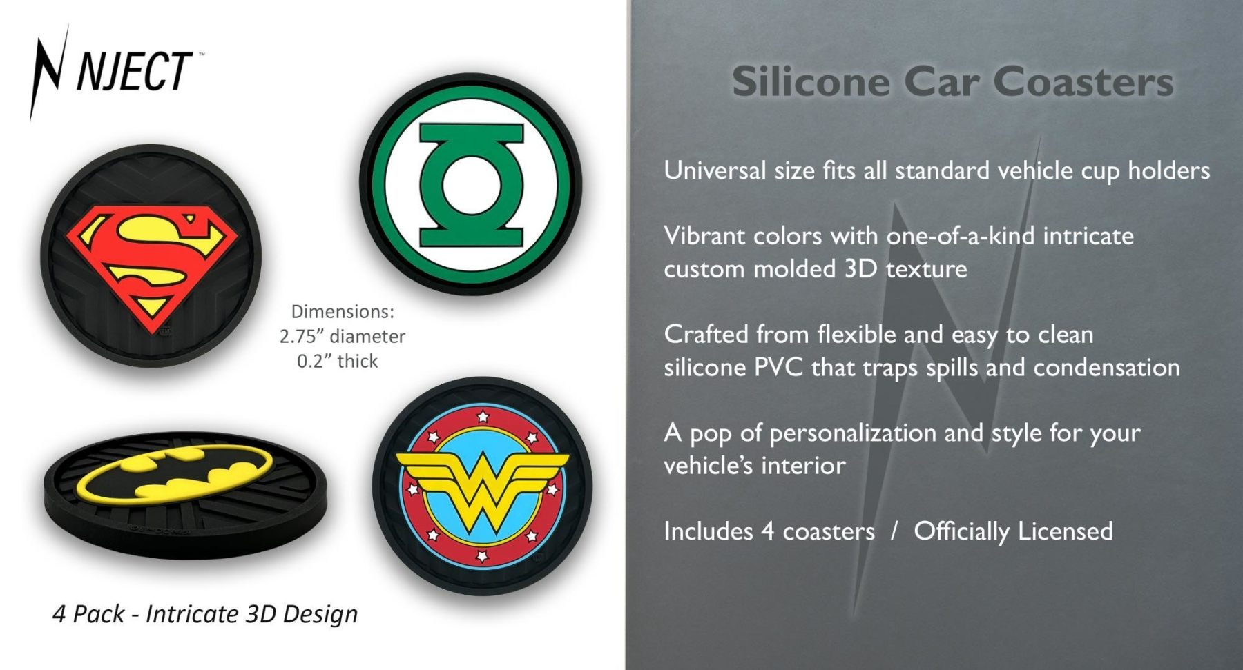 This 4-pack of silicone car coasters features vibrant colors and intricate custom molded 3D texture showcasing iconic DC Comics designs, including Batman, Superman, Wonder Woman, and Green Lantern. The raised detailing adds depth, durability, and visual impact while delivering a bold pop of personalization and style to your vehicle’s interior. Designed for everyday use, these silicone cup holder coasters combine practical protection with classic DC Comics character style in a durable automotive accessory.